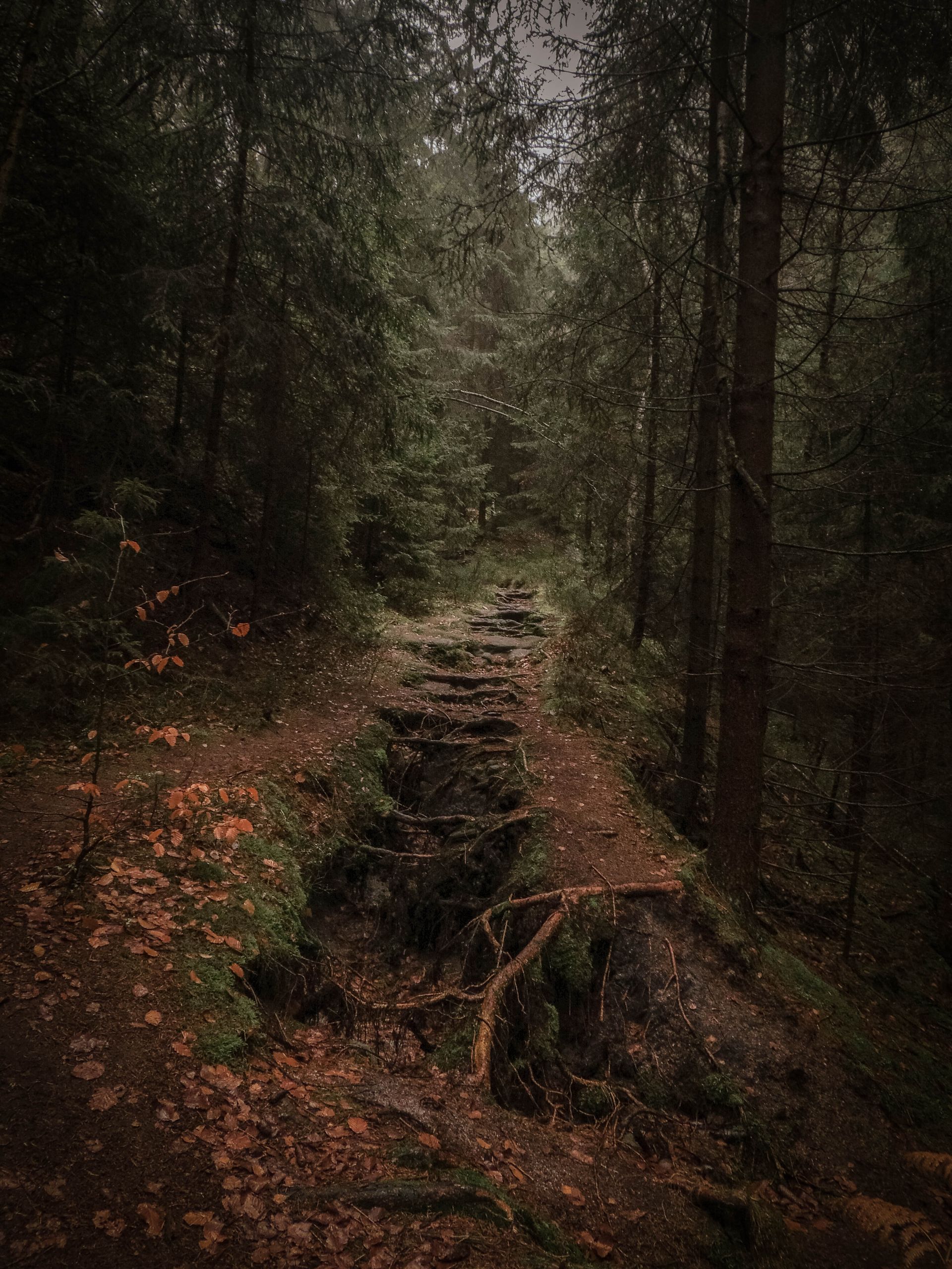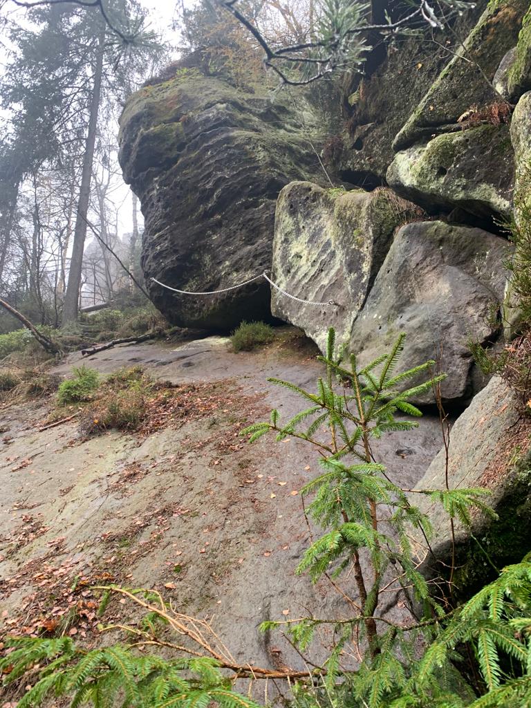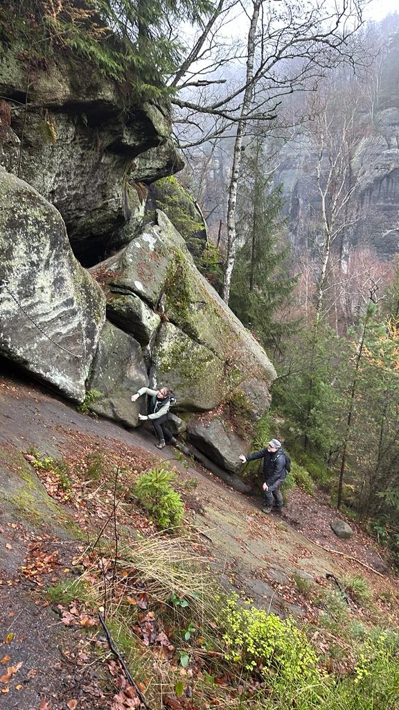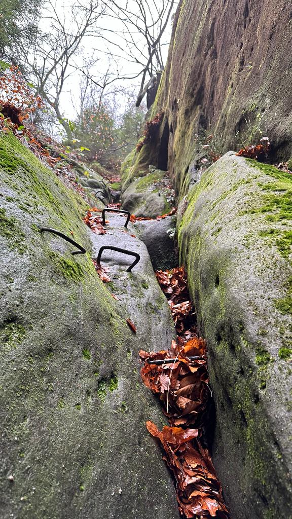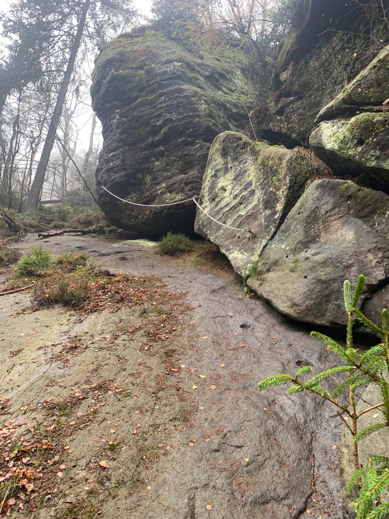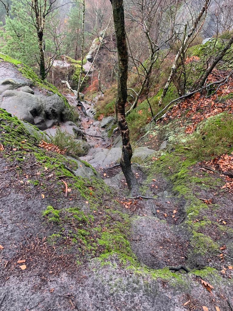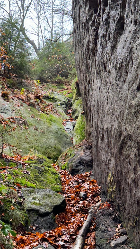 Letzteren (blauer Strich) folgen wir nun, vorbei an der Neue Wenzelwandaussicht, bis zum Abzweig in Richtung Friensteinflössel. Ein Glück, ein netter Ranger weisst uns direkt an der Wegreuzung darauf hin, dass die Feuerwehr den Wegweiser abgefahren hat und wir hier links abbiegen müssten um zum Satanskopf (unserem nächsten Ziel) zu gelangen. Gesagt, getan...am Friensteinflössel vorbei Richtung Friensteinstiege (grüner Strich) geht es den unscheinbaren Bergpfad zum Durchstieg des Satanskopfes hinauf, und das nur um hier die Mittagsrast einzulegen. Die ziemlich kühlen Temperaturen lassen uns nicht lange verweilen. Das Stück bis zur Friensteinstiege zurück, und es geht auf dieser (grüner Strich) hinunter bis zum Königsweg. Diese Stiege eignet sich gut für den Abstieg, sicher ausgebaut über Stufen und Kehren zügig bergab. Wiederum nach links geht es nun dem rotem Strich folgend auf dem Königsweg weiter. Der hintere Heideweg biegt rechts ab, wir bleiben aber auf geradem Kurs. Der Königsweg wurde hier zwar freigeschnitten, aber einige Käferfichten liegen wieder quer. Übersteigen oder drunter durch...das Problem wird größer nachdem wir, nur unter Zuhilfenahme der Komoot App, den Pfad, welcher uns linker Hand zum Einstieg der Wolfsfalle bringen soll, gefunden haben. Zum Teil liegen die Bäume übereinander, der Weg nur schwer zu finden. Zeitraubende Kletterei und in kriechend drunter durch. Ab und zu zeigt ein abgesägter Ast an, wo wir richtig sind. Diese sehr interessante Stiege ist also noch nicht ganz vergessen. Viel Laub liegt in den ersten Felsgassen bevor wir die Eisenklammern erspähen. Hier müssen wir nun rauf....und jetzt wird dir klar vor Augen geführt...als eher kleiner Mensch bist du so was von im Nachteil ;-). Die erste Stahlklammer erscheint so endlos weit entfernt...ist sie aber erreicht geht der Rest dann doch locker von der Hand. Kräftezehrend ist dieser kurze aber knackige Aufsteig dennoch, und wieder mal auf der oberen Affensteinpromenade angekommen verschnaufen wir kurz.