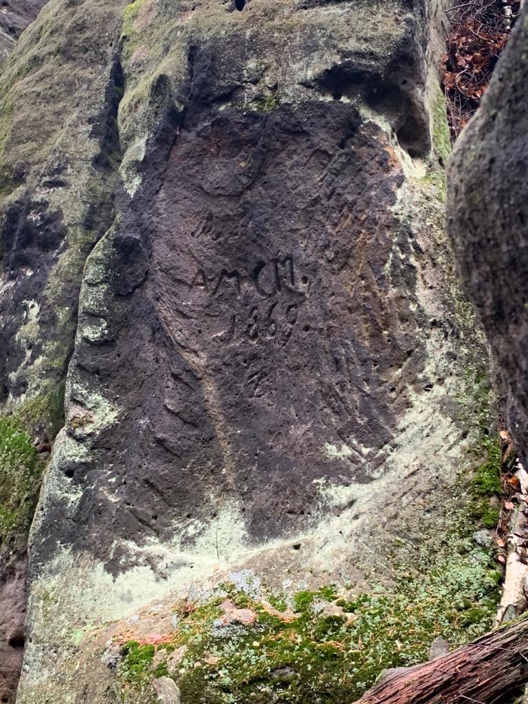 Diesen Bergpfad folgen wir alsbald nach rechts wo wir die Hentzschelstiege kreuzen und am Ausstieg der Zwillingsstiege vorbei wandern. Hier und da etwas kraxelnd und unter einem Klemmblock , die 2 Stahlringe nutzend, schlängeln wir uns durch die Affensteine bis nach rechts die Wilde Hölle ins Tal abzweigt. Nach links käme man zum Carolafelsen, wir halten uns aber geradeaus. Nun müssen wir aufpassen den Abzweig, welcher wiederum rechts liegt, in die (Zahme) Hölle nicht zu verpassen. Leider ist dieser historisch Weg nicht markiert und wird auch nicht mehr Instand gehalten. Dennoch bietet er sich als Alternative zu den oft überfüllten Wanderwegen an, da er keine großen Herausforderungen beinhaltet, aber interresante Stellen bietet. Einige Innschriften zeugen von der Bedeutung die dieser Steig (zugehörig zum Reitsteig) einmnal hatte. Und Smiley´s gab´s auch schon vor 100 Jahren...