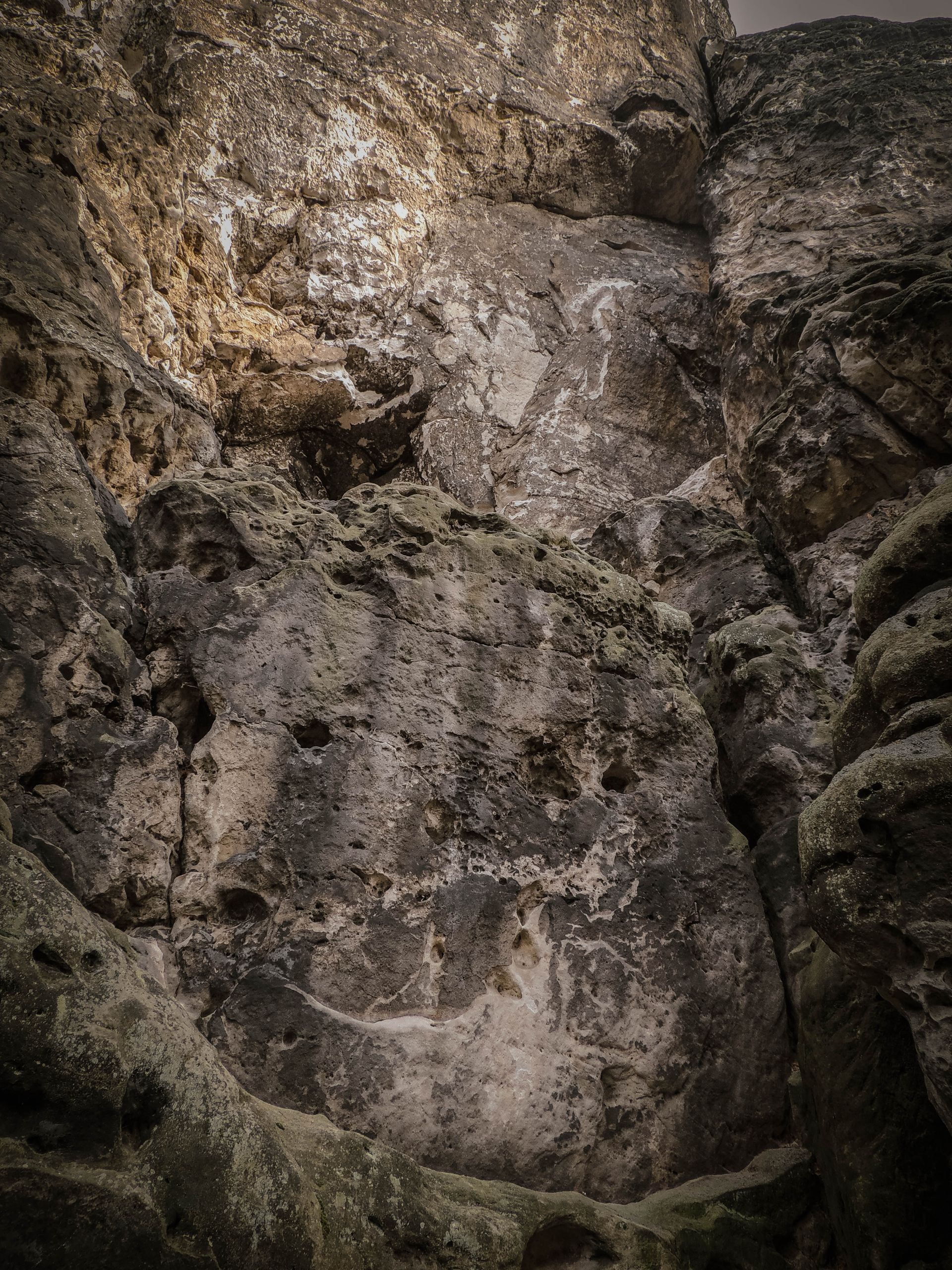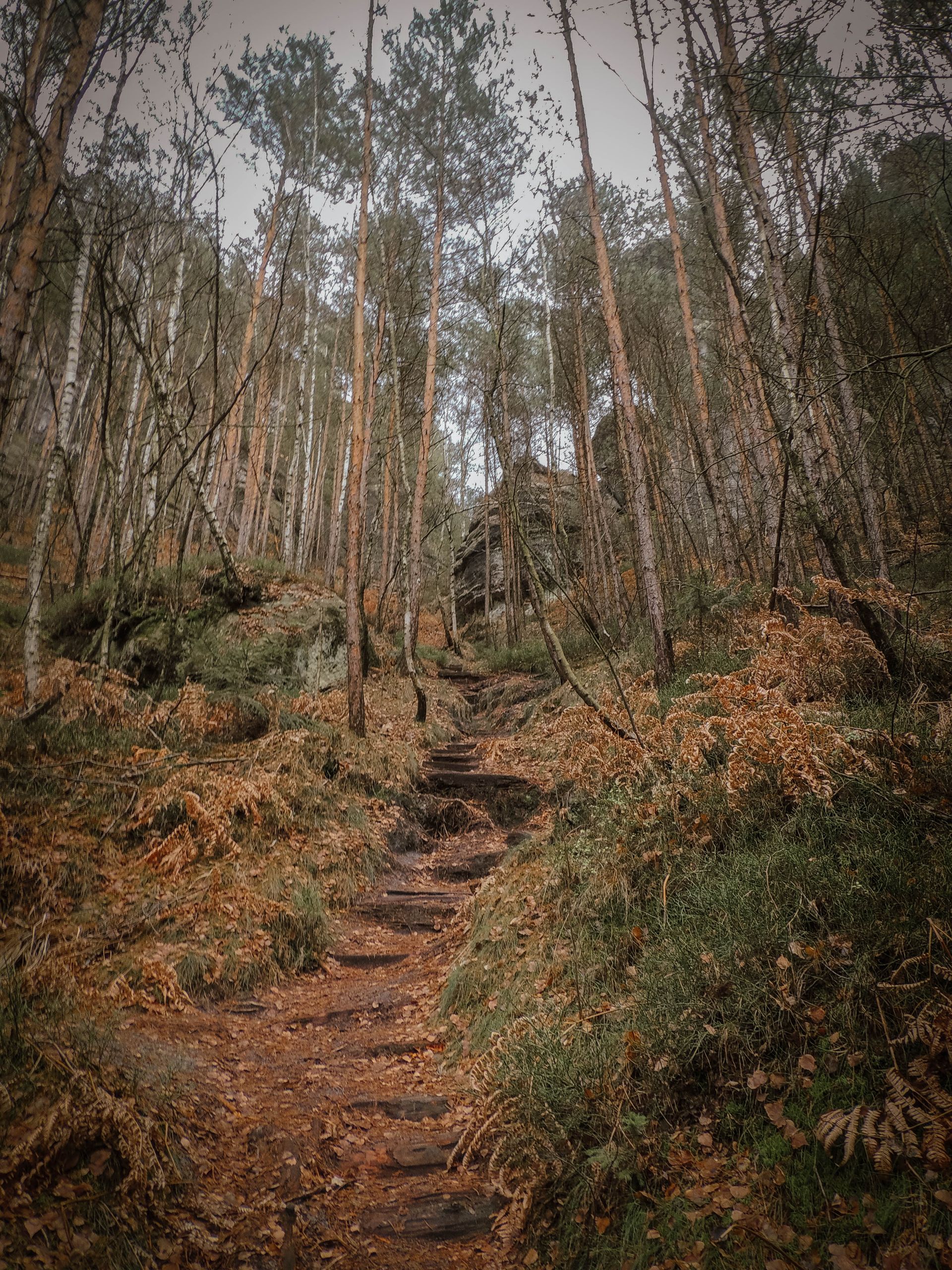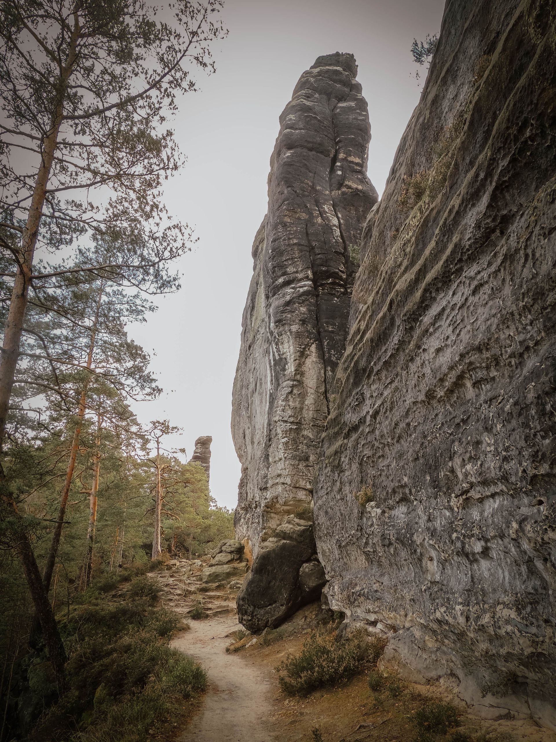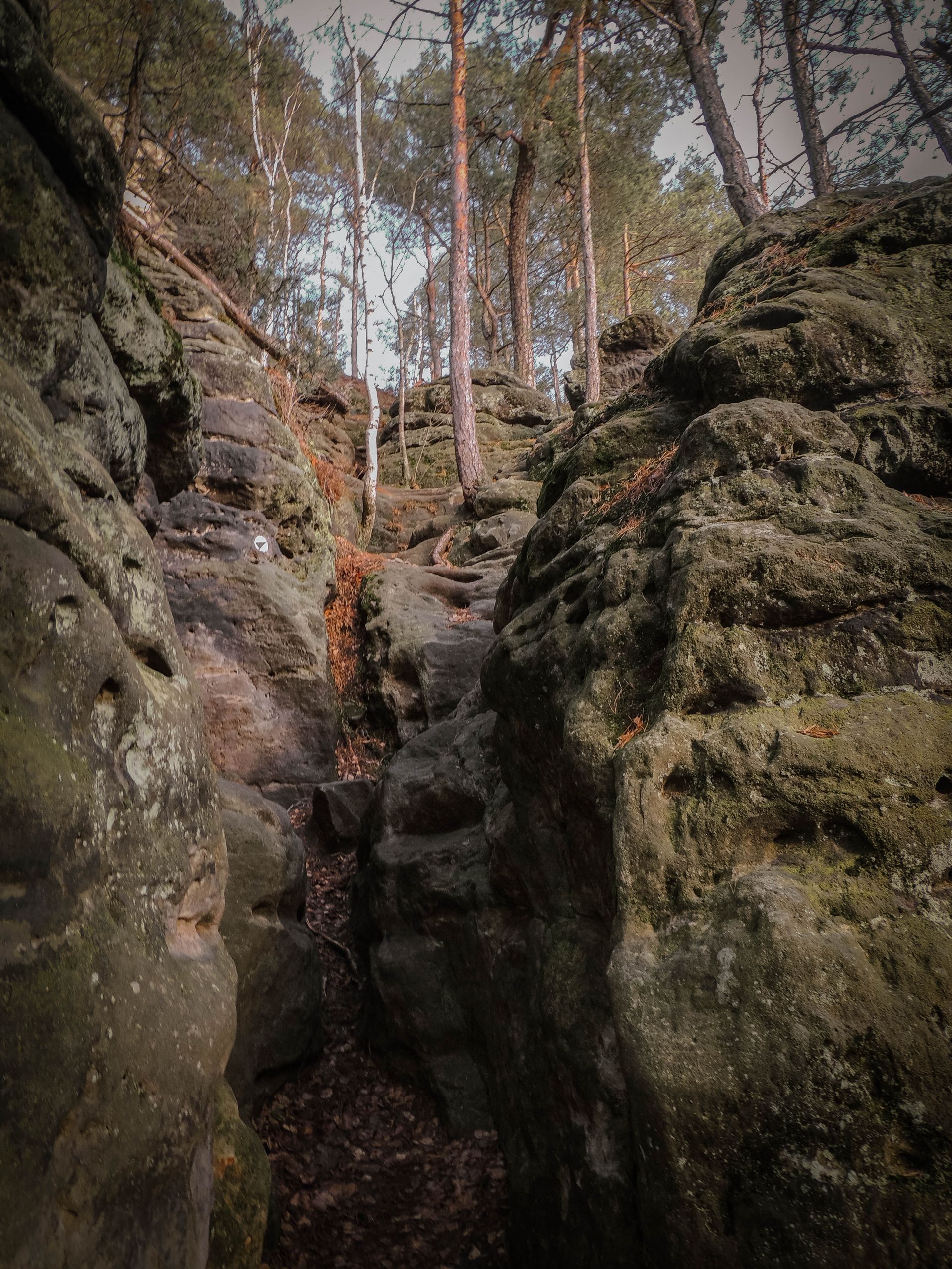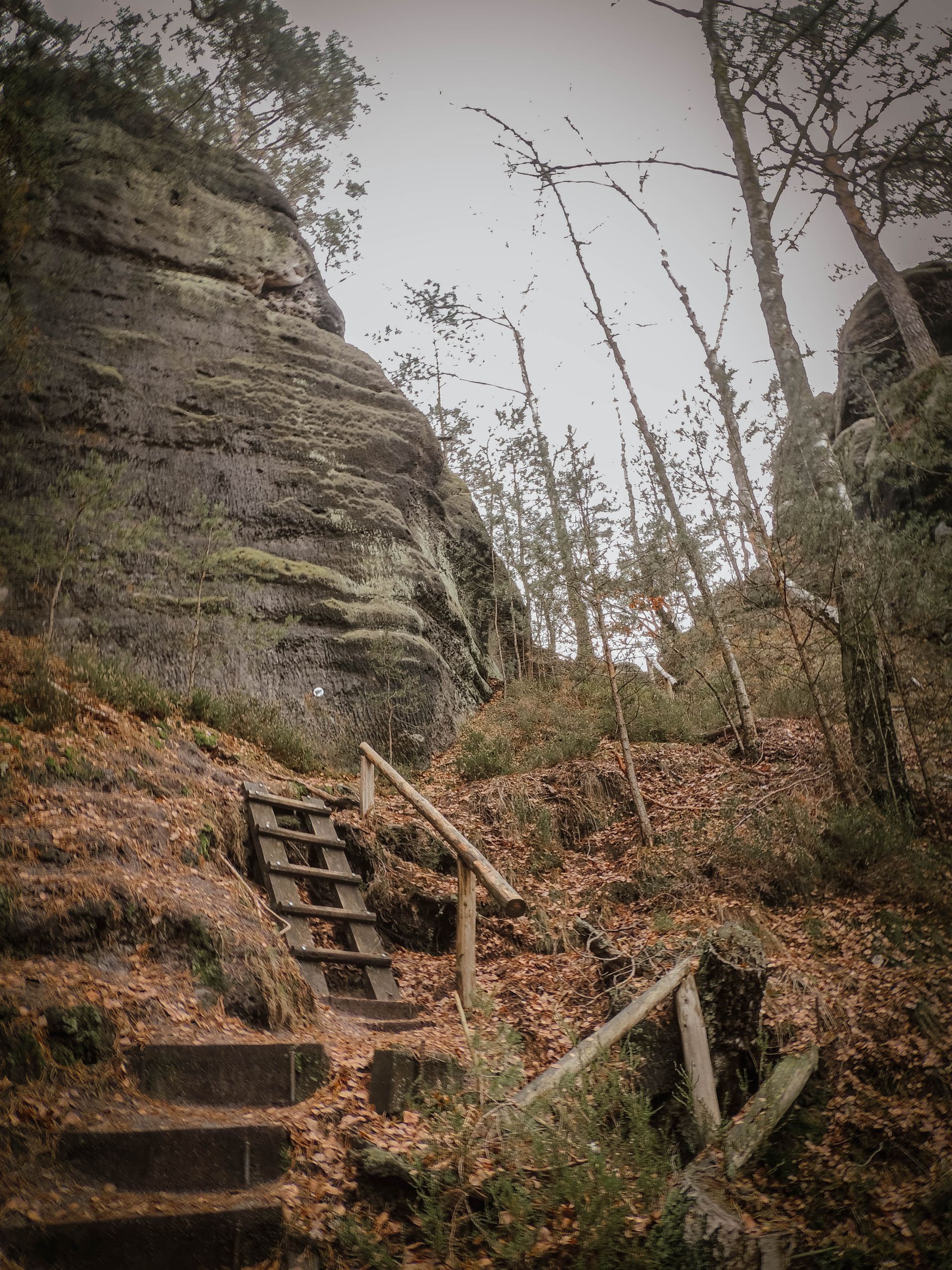 Wir starten am Bahnhof in Rathen und setzen mit der Fähre über. Unsere Wanderung geht nun an diesem milden Dezembertag zuerst in Richtung Amselsee / Felsenbühne (roter Balken). Doch an der Strassenkreuzung biegen wir nach rechts in Richtung Waltersdorf ab (roter Balken, roter Punkt). Am Haus des Gastes (Feuerwehr) geht es nach links in den Garagenkomplex hinein, um an dessen Ende wiederum nach links abzubiegen. Der Weg führ nun ansteigend durch Wald und an der nächsten Gabelung bleiben wir am Wandrand auf Geradeauskurs. Auf der Wiese laufen wir bis nach rechts deutliche Pfadspuren in Richtung Felsen führen. Ansteigend bis zum Fuß des Talwächters gelangen wir zum Einstieg in den Jungfernsteig. Dieser wird uns an seinem Ende durch das Jungfernloch bzw. die Talwächterhöhle führen. Alte Steinstufen zeigen uns den Weg. Die Stiege ist nicht lang aber sehr reizvoll. Ein wenig kraxeln muss man schon, und am Ende helfen noch ein paar Eisenklammern. Schon stehen wir in dem Felsdurchgang und können eines weiteres unserer heutigen Ziele erkennen. Denn in einiger Entfernung, am Ende der Honigsteine erhebt sich die Lokomotive, eines der Wahrzeichen der sächsischen Schweiz und ein sehr beliebeter Klettergipfel.