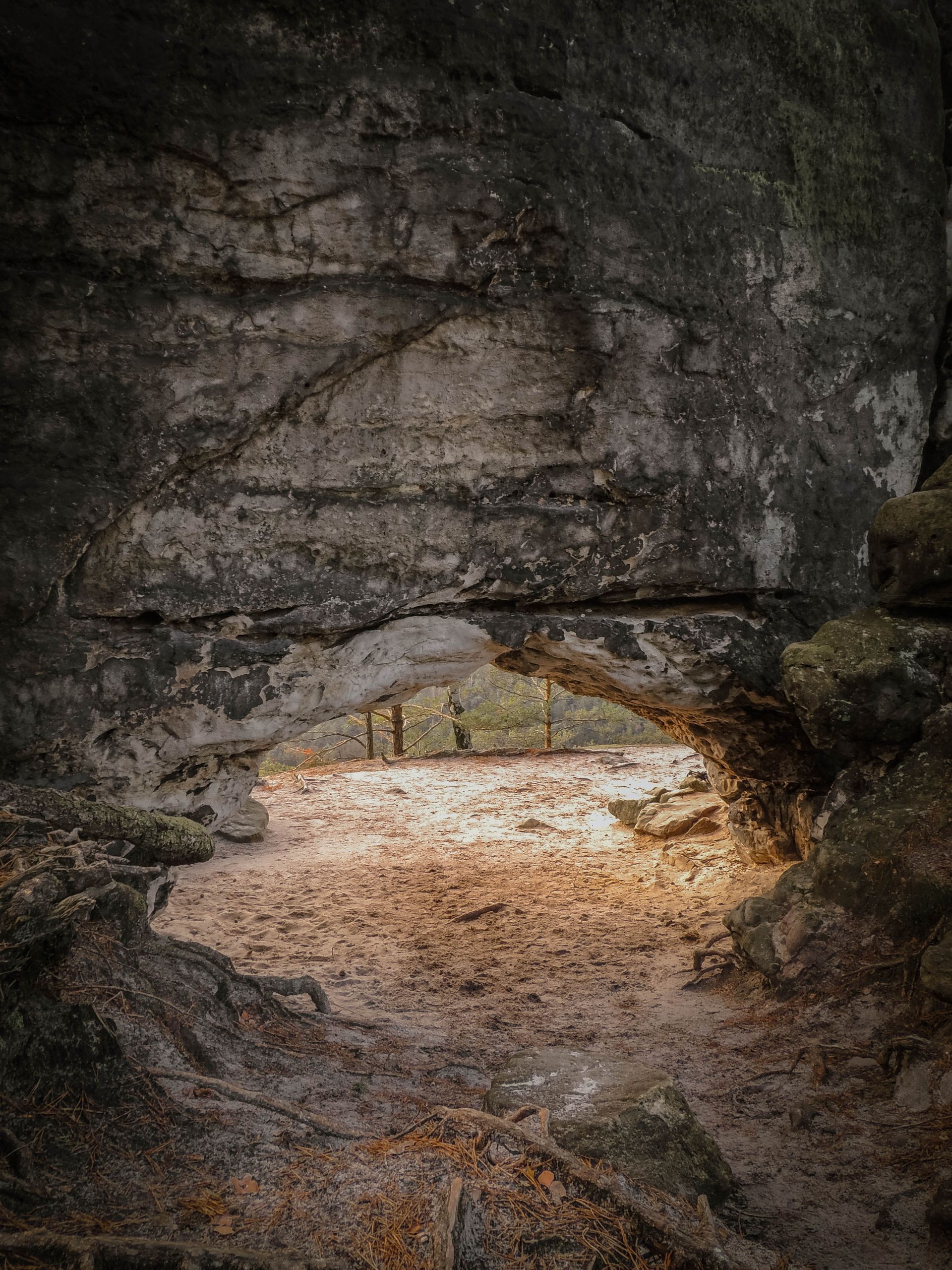 Der Weg auf den Gamrig ist unspektakulär und leicht zu bewältigen, die Aussicht in alle Richtungen wirklich toll. Leider auf Grund der Nähe zum Parkplatz immer gut besucht und oft mit "Gedränge" verbunden. Etwas Vorsicht ist geboten denn es gibt keine Geländer im gesamten Gipfelbereich. Nach dem Rundumblick geht es auf gleichem Weg wieder abwärts und auf der Wanderung in Richtung Parkplatz zeigt uns ein Wegweiser den Zugang zur Gamrighöhle an. Dieser statten wir noch einen kurzen Besuch ab, um beim Verlassen jener den Kletterzugang am Felsfuss in Richtung Parkplatz zu nutzen. Von hier aus wollten wir den Weg durch den Diebskeller nutzen, was leider aktuell nicht möglich ist. Nach einem Versuch der uns 30m voran gebracht hatte mussten wir aufgeben und umkehren. Auch hier wurden "Verkehrssicherungsmassnahmen" durchgeführt und Bäume direkt im Zugang übereinander gestapelt. Diese Vorgehensweise hat ja schon Tradition. So nutzen wir den Waldweg durch den Aspichgraben für den Rückweg. Noch einmal sehen wir an einer Lichtung zu den Gipfeln der Feldsteine / Honigsteine hinauf ehe die ersten Häuser auftauchen. Durch den Ort in Richtung Fähre wandernd erglänzt noch ein mal die Burg Altrathen im Nachmittagslicht. Abschiedsstimmung beim Übersetzen über die Elbe und unsere heutige Sandsteintour geht zu Ende.