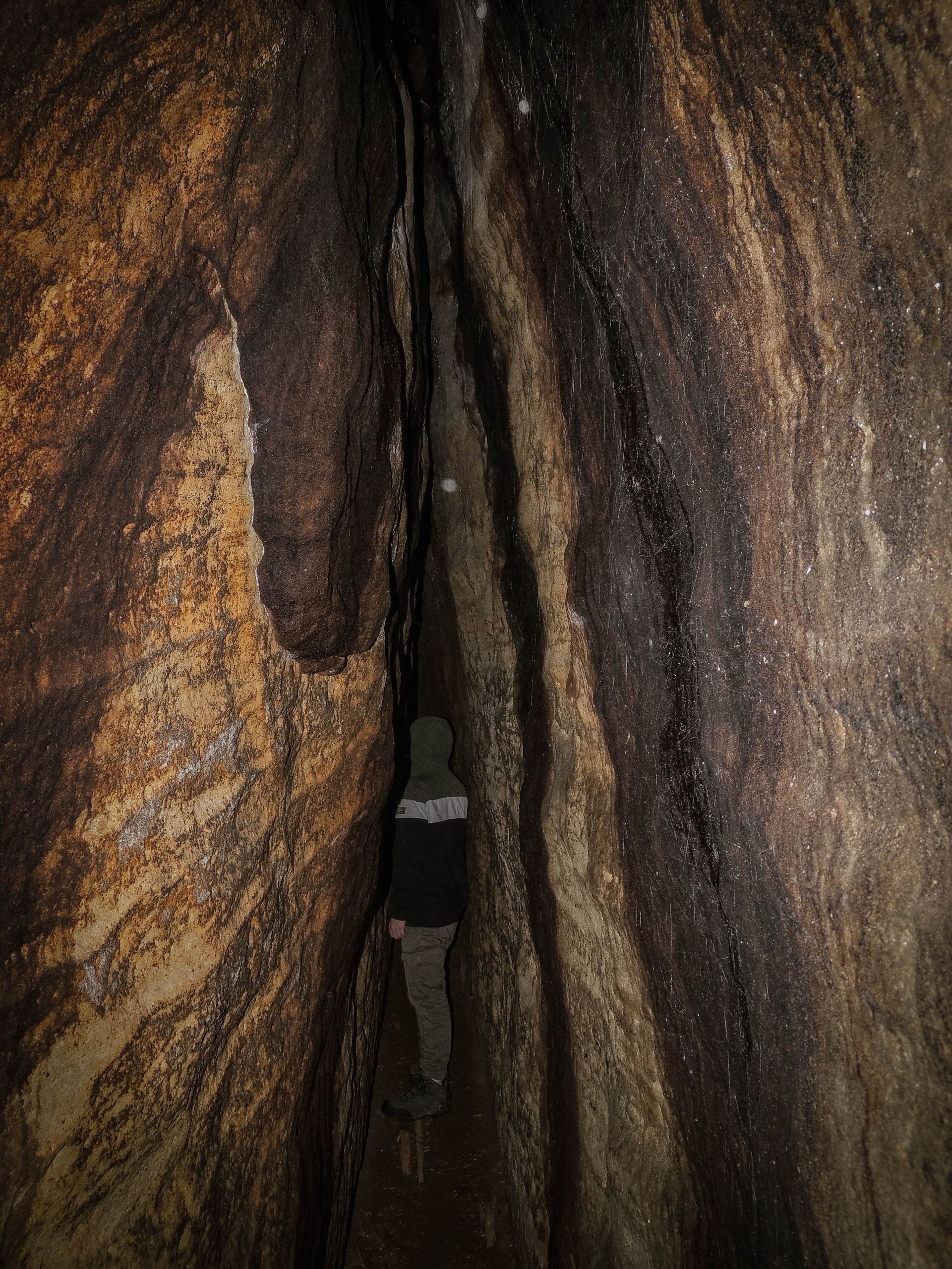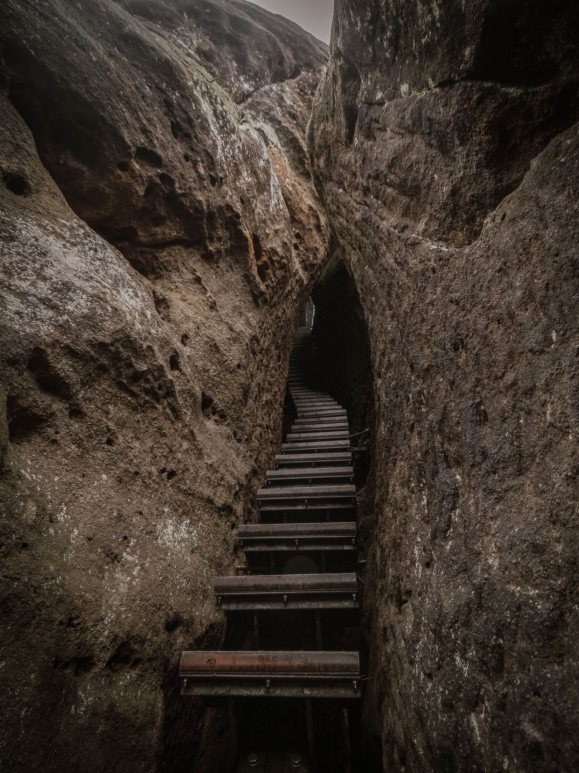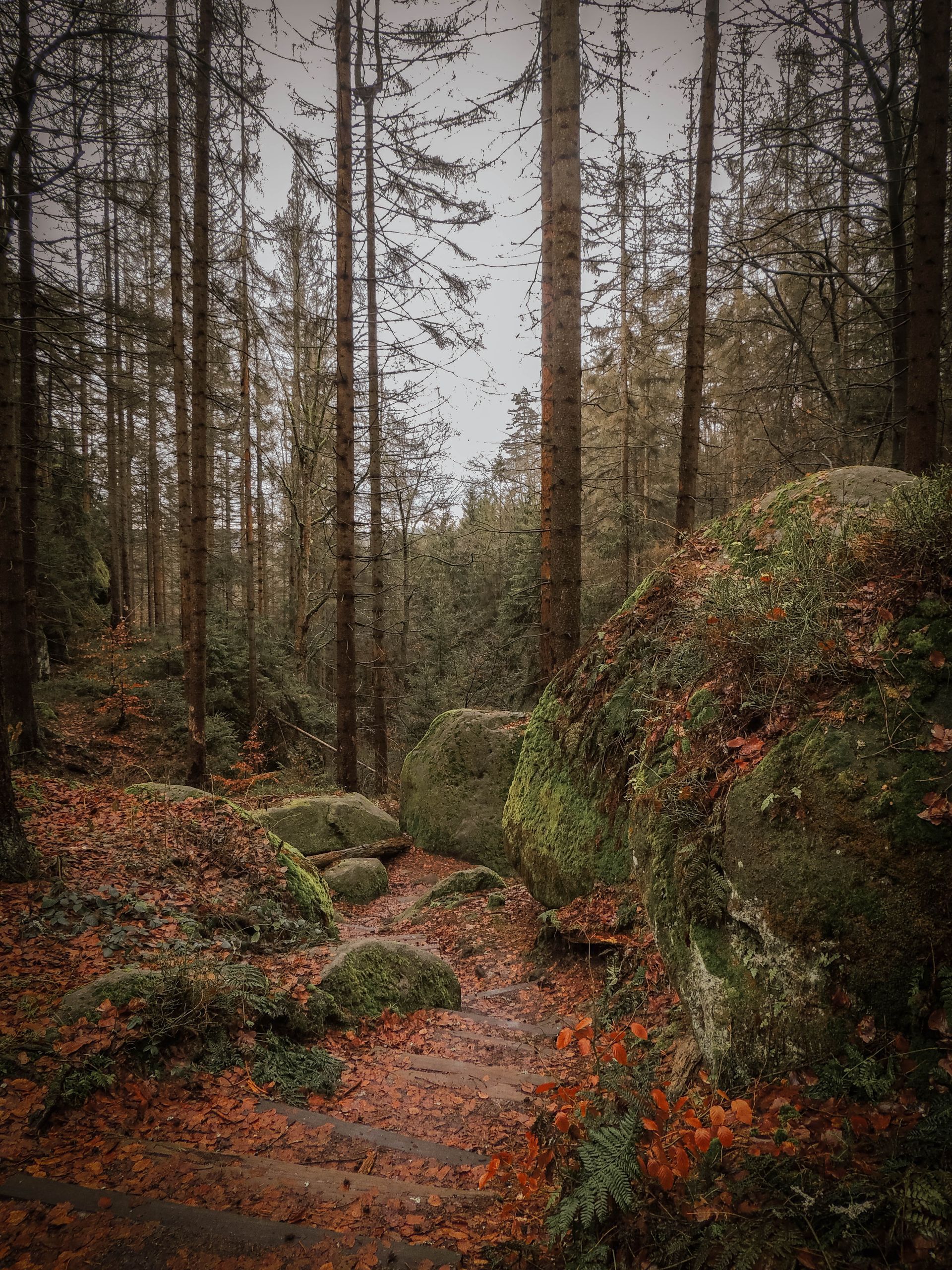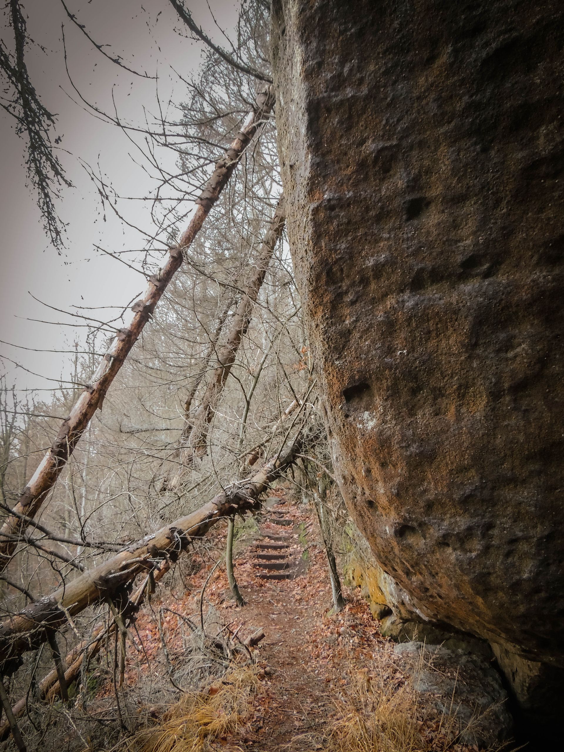 Keine Kahnfahrten, abgelassene obere Schleuse der Kirnitzsch und kein Königswetter? Das klingt nach guten Bedingungen für eine besinnliche Sandsteintour zwischen den Feiertagen im Gebiet um Hinterhermsdorf. Dazu kommt das der Touristenparkplatz der Buchenparkhalle auserhalb der Kahnsaison kostenlos ist. Wir starten zu unserer heutigen Sandsteintour von besagtem Parkplatz auf dem breiten Hohweg vorbei an ein einigen Gärten schnurgeradeaus in Richtung Bootstation (blauer Balken). Dem blauen Balken folgend verlassen wir den komfortablen Fahrweg durch den Dachshälter und vorbei an der Dachshöhle. Diese Höhle ist ein schmaler Spalt der sich recht weit in den Fels hinein zieht, unzählige Spinnen inclusive. Einige Stufen erleichtern den ersten Abstieg in Richtung Kirnitzschtal. Auf der breiten Zufahrt zur Bootsstation angekommen sollte man direkt auch dahin gehen, wir machen aber nach nur wenigen Metern den Schwenk nach links hinauf. Die Fahrspuren zum Ladenweg sind ganz gut zu erkennen und wir gewinnen wieder an Höhe. Auf dem Plateau wird es aber immer verwachsener und wilder. Fichtenjungwuchs, umgefallene Bäume, zerwühlte Pfade, Wildschweingeruch....im Roschengrund angelangt wird es immer unheimlicher. Letztendlich folgen wir nur noch den Wildspuren durch Fichtendickicht in das Tal. Wir kämpfen uns (mit zum Teil flauem Magengefühl) bis zum Wettinweg (roter Balken) durch. Kurze rechts und dann gleich den Pfad nach links einschlagend (roter Balken) geht es nun, unter uns immer die Kirnitsch im Blick, bis zur Bootstation.