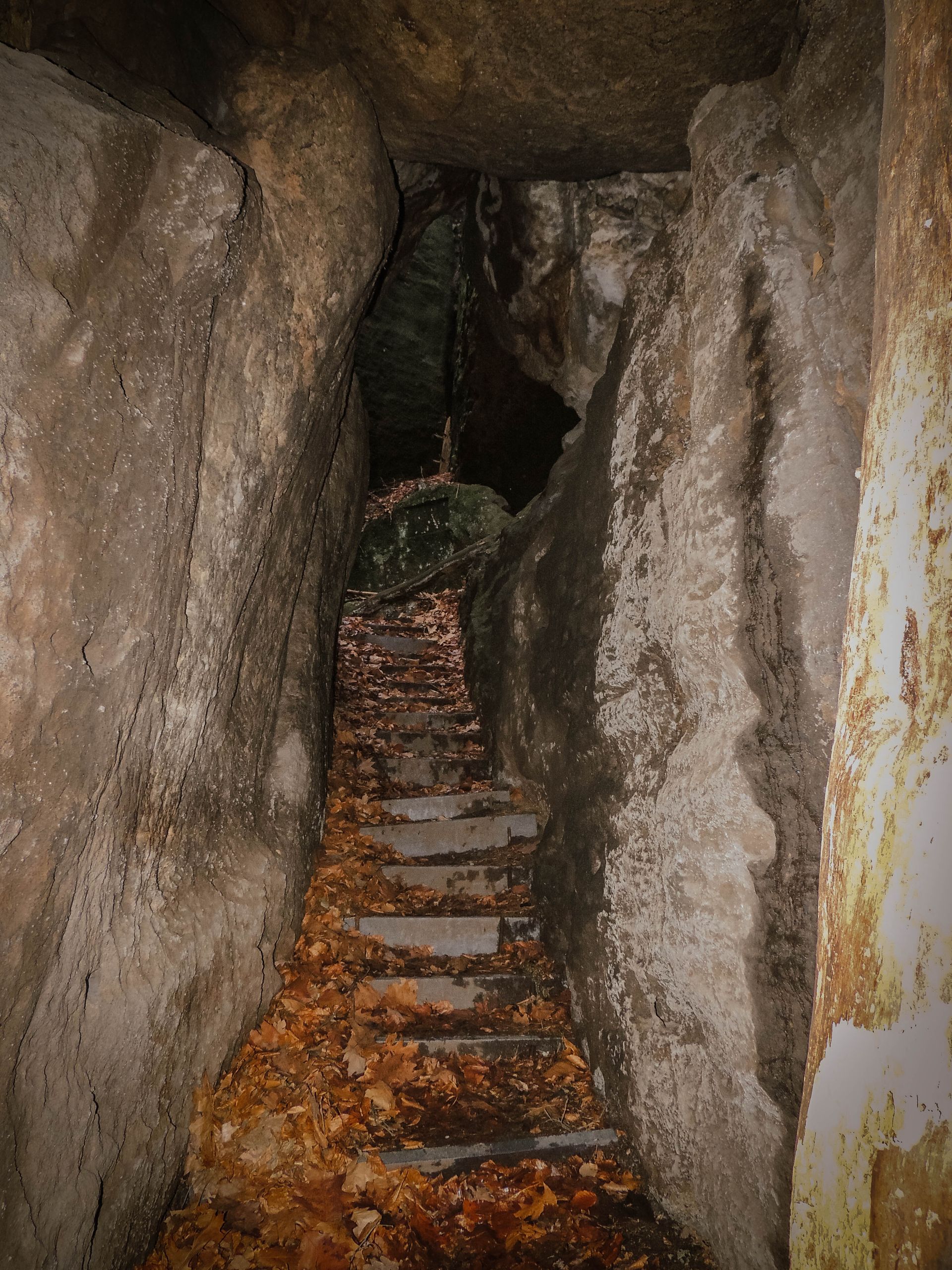 Ungewöhnlich, aber ungestört bringen wir unser Mahl zu Ende und laufen dem roten Balken folgend dem fast ebenen Schleusenhornweg bis zur Einmündung auf den Hohweg (grüner Balken). Jetzt nach links weiter um nur wenig Meter später nach rechts einem Forstweg in Richtung Wolfssteinweg zu folgen. Zunächst noch gut beghbar ändert sich die Beschaffung des Weges auch hier zunehmend. Immer mehr Bäume sind zu übersteigen, der Forstweg wird zum Pfad und im Bereich des Wolfstein-Steines unpassierbar. Der Abstieg in das Tal zum Hollweg gelingt auf schmalen teils sehr steilen Pfaden durch das Gelände. Unten angekommen geht es nach links weiter bis der mit dem roten Balken gekennzeichnete Tunnelweg rechts abbiegt. Da markiert wurde der schmale Weg freigesägt. Ein teils sehr schlammiger und etwas längerer Aufstieg steht uns bevor. Stetig geht es nun in einigem Zick Zack immer weiter hinauf und durch die namensgebene Tunnelpassage hindurch. Noch einge Stufen helfen bei den letzten Metern und wir gelangen auf den Königsplatzweg. Wir steuern den linker Hand gelegenen Aussichtspunk an, welchen wir vom Ausstieg aus schon erkennen können.