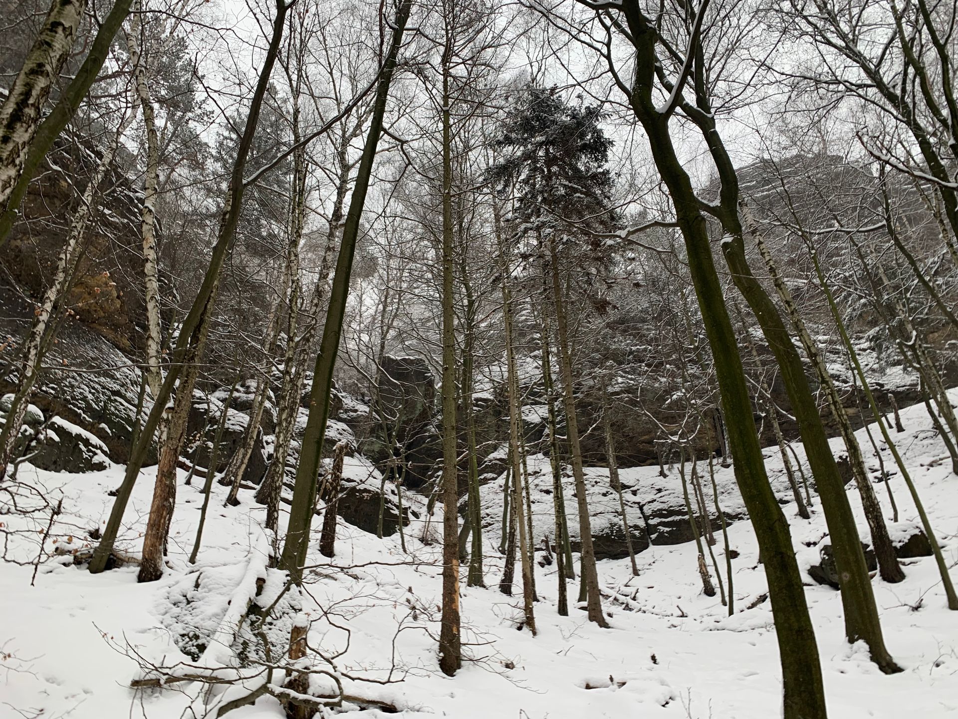 Am Eingang des Kuhstalls wieder angekommen steigen wir nun durch die Nasse Schlucht in Richtung kleiner Winterberg ab. Bei dieser Witterung ist jeder Schritt mit Bedacht auszuwählen, es ist sehr glatt! Bedächtig geht es über die Stufen bis zur großen Wegkreuzung hinunter und in gerader Richtung auf dem Fremdenweg (roter Punkt, Malerweg) weiter. Leicht steigend erreichen wir dann die breite Zeughausstrasse welcher wir nach links folgen. Den Abzweig zu den Quenen Wiesen (grüner Balken) lassen wir rechts liegen um nach einem kurzen Gefälle an der Schutzhütte nach rechts in Richtung Zeughaus abzubiegen. Noch bevor wiederum rechts die Buchschlüchte zum hinteren Raubschloss führen, geht es ebenfalls rechts unmarkiert in eine Schlucht hinein. Der Weg ist nicht zu übersehen, eher breit wie ein Forstweg. Dieser bringt uns direkt auf den Königsweg (roter Balken). Nach rechts geht es nun auf schmalem Pfad am Fuß der Bärenfangwände entlang. Es sind nur Tierspuren im Schnee zu sehen, erleichtern uns aber die Orientierung. Wir schlängeln uns nun immer weiter ohne größere Höhenunterschiede bis wir auf das von Links einmündende Heringsloch (grüner Balken) treffen. Wir bleiben auf gleicher Höhe dem Königsweg treu, vorbei am rechts abzweigenden Quenengrund. Weiterhin sind wir die ersten Spurenleger im Schnee, und unser Mittag nehmen wir auf Grund der Wetterlage im Laufen zu uns. Tatsächlich gibt es nun den ersten Gegenverkehr am heutigen Tag, Skiläufer?! Ja, nur die Ski tragen die Wintersportler über ihren Schultern, alles andere macht auf diesem Pfad über Stock (Bäume) und Stein (Felsen) auch keinen Sinn. Wir können uns deren Ziel nicht so richtig erklären, aber die Jungs werden schon irgend einen Plan haben. Uns erleichtert das natürlich die Wegfindung, und dem Königsweg folgend wurden die SKI schon an der Wegkreuzung zum Aufstieg auf den kleinen Winterberg abgeschnallt.