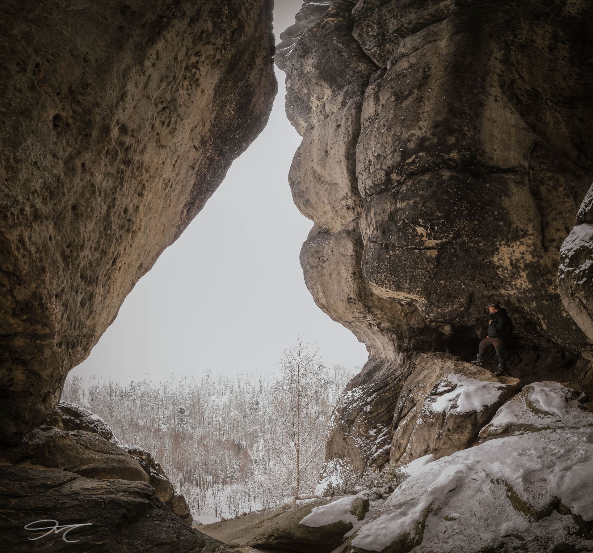 Über Nacht gab es ca. 10cm Neuschnee und daher auch die Hoffnung, dass es am "Kuhstall" mal nicht mit Touristen überfüllt ist. Vom Lichtenhainer Wasserfall starten wir unsere Sandsteintour also direkt in Richtung neuer Wildenstein (roter Punkt) über die Brücke zur Kuhstallstrasse. Am alten Wasserwerk vorbei geht es erst einmal Bergauf. Am Kletterfelsen Münzstein nutzen wir die Abkürzung über die Kuhstallstiege, deren Verlauf anhand einzelner aus dem Schnee blitzenden Stufen zu erkennen ist. Auf jeden Fall konnten wir so 2 andere Wanderer vor uns komfortabel überholen. Es ist nicht weit vom Startpunkt aus bis zum neuen Wildenstein und schon nach kurzer Zeit haben wir diesen auch erreicht. Tatsächlich ist noch kein Mensch in Sicht und für ein paar Minuten sind wir hier allen. Dann kommen die zuvor überrundeten Wandersleut an und wir huschen schnell durch den Höhlengang in Richtung Himmelsleiter. Gut ausgeschildert und mit Stahltreppen ausgebaut geht es auf das Plateau des neuen Wildensteins hinauf. Die Stiege ist gut begehbar, viel Schnee kommt hier in dem engen Spalt nicht an. Die Aussicht ist leider nicht toll da sehr trübes Wetter herrscht. Der Rundgang führt uns über eine Steinbogenbrücke, unter welcher man noch Reste des ursprünglichen Abstieges erkennen kann, wieder auf die Höhe des Kuhstalls herunter. Kurzer Abstecher in gebückter Haltung durch die "krumme Karoline" und ein wenig Kletterei zwischen den Felsmurmeln dahinter, sind kurzweilig und offenbaren einen schönen Blick durch ein großes Felsloch Richtung hintere sächsische Schweiz. Durch einen hohen Spalt zurück und jetzt noch zum Schneiderloch. Gut mit Geländer gesichert geht es in die mehrstöckige Höhle hinein, zur oberen etage mit Ausblick helfen ein par Eisenklammern. Wir geniesen noch einen Moment die hier nicht alltägliche Einsamkeit, und verlassen das Schneiderloch auf gleichem Weg wie wir gekommen sind.
