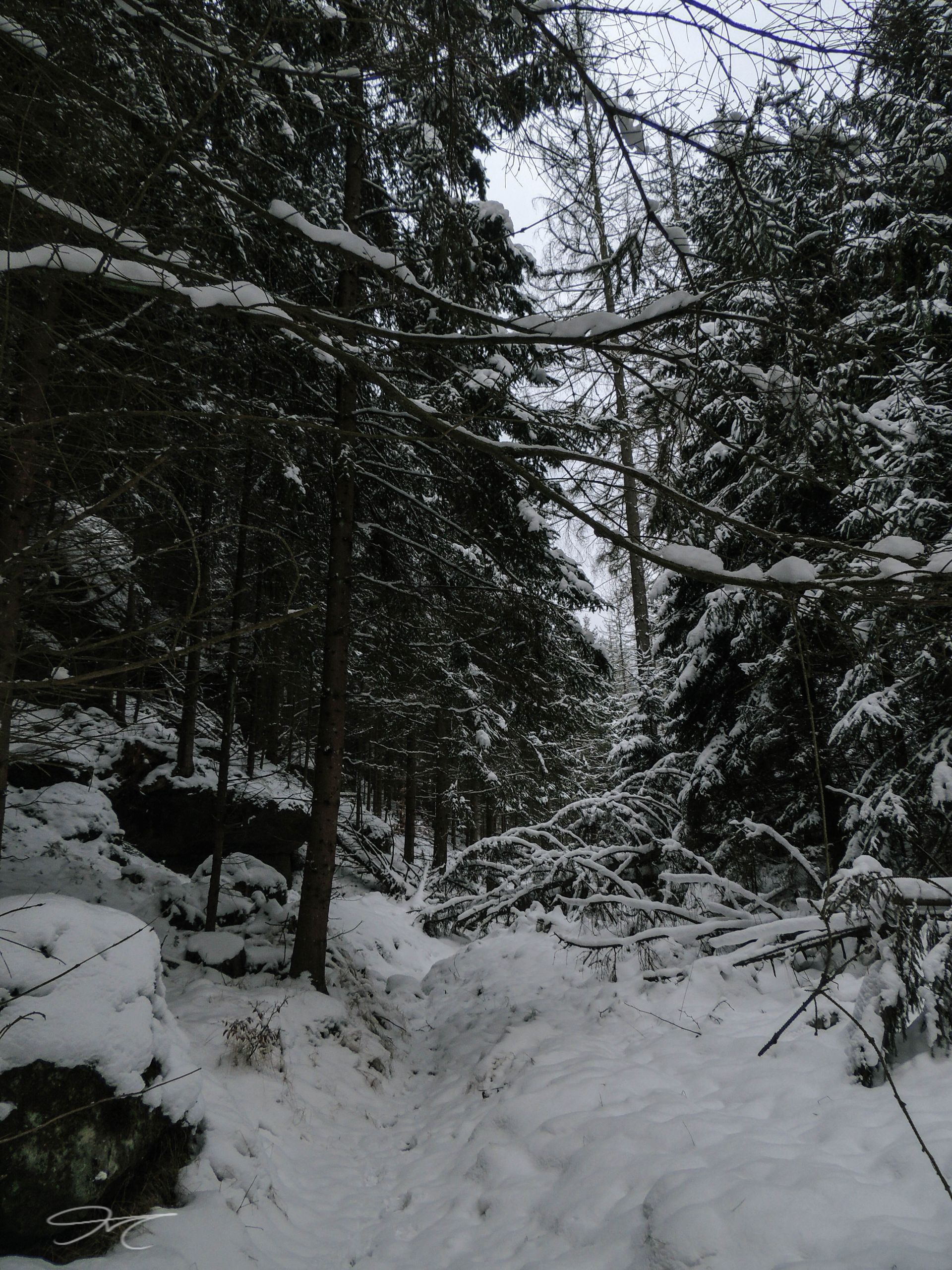 Genau an dieser Kreuzung sollte man dem roten Punkt folgend nach rechts zur Zeughausstrasse abbiegen, wir nehmen aber die Herausforderung an und verbleiben auf dem Königsweg (roter Balken). Keine ganz so gute Idee wie sich herausstellen sollte denn alle Schlüchte am hinteren Spegenhorn sind mit Totholz überfüllt. Der Schnee tut sein übriges und so stehen wir zum Teil hüfthoch in der weissen Pracht und schlagen uns kreuz und quer durch das Unterholz auf einem der angenommenen Forstwege bis zur Zeughausstrasse durch. Glücklich da gesund angekommen zu sein, nehmen wir den gesicherten Weg wieder auf, und bewegen uns nach links weiter (grüner Balken). Am unteren Ende des Dietrichsgrundes biegen wir dann nach rechts auf den Räumichtweg ab. Dieser führt uns breit ausgefahren bis zum Abzweig Seibtweg (links). Zunächst noch breit angelegt wird der Weg zum Pfad und führt durch dichten Neufichtenbewuchs. Immer schmaler und immer dichter werdend verpassen wir den kaum zu erkennenden Abstieg zur Kirnitzsch hinunter. Einige hundert Meter später fällt das dann doch auf und wir machen Kehrt. Wir erkennen den schmalen und steilen Pfad im Dickicht kaum, rutschen diesen (jetzt rechts gelegenen) Zickzackkurs irgenwie zu Tale, und gelangen so in die Nähe der Brücke über den Fluss zurück zu unserem Ausgangspunkt von heute Morgen. Ein sehr winterliche Sandsteintour(tur) die dennoch viel Spass gemacht hat geht zu Ende.