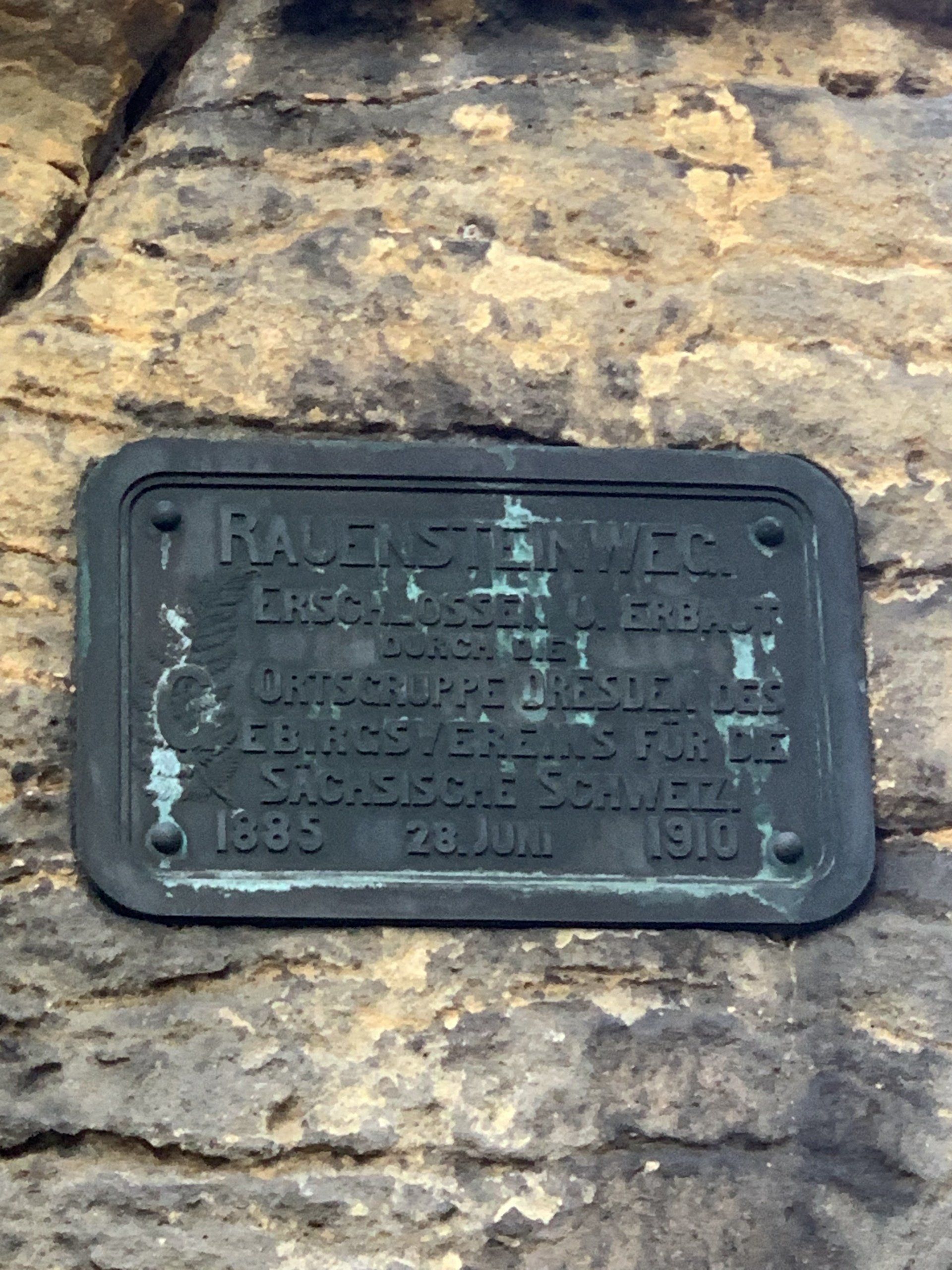 Natürlich wollen wir den uns noch fehlenden Teil des Gratweges abwandern und so geht es nun in Richtung Osten auf dem Felsrücken weiter. Etliche Steighilfen über Tritte, Leitern und Stufen zum großen Teil aus Metall bringen uns in ständigen Auf-und Ab über den Rauenstein. Ein Blick unter so manchen stählernen Einbau zeigt noch die alten Steiganlagen aus Stein. Es wird auch mal etwas enger aber nicht wirklich schwierig. Alles recht gut ausgebaut und gesichert und nicht nur für Kinder ein Erlebnis. Die längste Leiter füht in die Lehmannschlucht in welcher dann auch Tafeln an die Erbauer erinnern. Eine Höhlendurchsicht ermöglicht noch ein mal einen etwas anderen Blick zur anderen Elbseite und schon bald errichen wir den Abzweig zur Bergbaude. Nicht der Blick auf die Preistafel sondern die Aussicht bewegen uns zu dem kurzen Abstecher das Stück hinauf. Dennoch ganz gut besucht zwängen wir uns durch die hunrigen und durstigen Gäste um eine letzte Aussicht zu geniesen. Wir haben von hier aus auch den Parkplatz in Sicht welcher an welchemn sich diese äusserst kurzweilige Sandsteintour-Runde nach einem letzten Abstieg schließen wird.