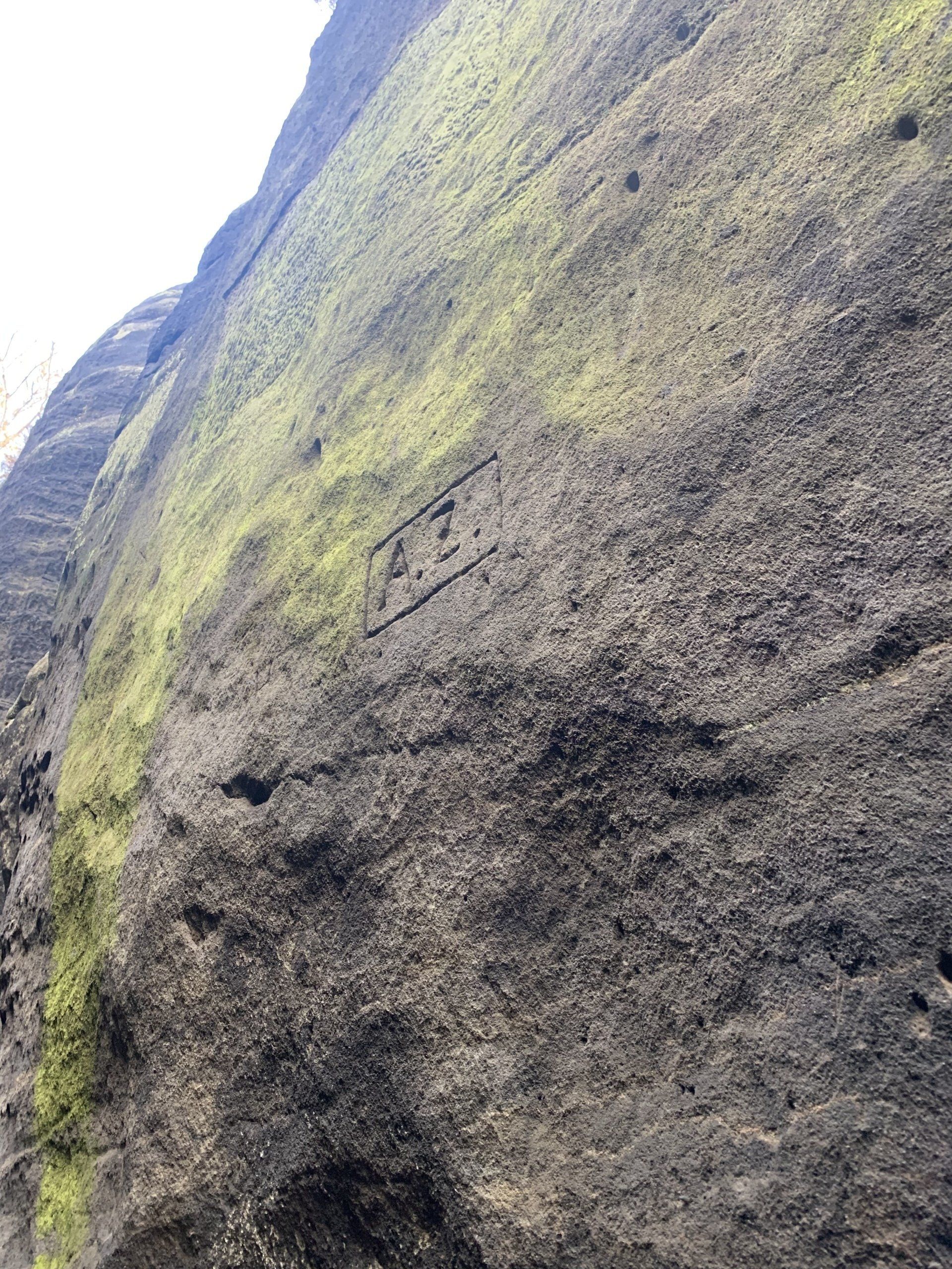 Die Strasse schon im Blick zweigen wir in den breiten Weg nach links ab um nur wenige Meter später nach rechts in den Lehmweg abzubiegen. Dieser macht seinem Namen alle Ehre und zeigt uns unmissverständlich an dass wir richtig sind. Wir treffen dann auf den mit rotem Strich markierten Wanderweg, folgen diesem in Richtung Rauenstein und kommen nach einem "feuchten" Aufstieg auf der Süd Seite eben jenes Steines an. Setzen nun unsere Wanderung aber entgegengesetzt der Markierung nach links fort, dürfen im weiteren Verklauf unseren nochmaligen Aufstieg durch den oberen Teil des Flüchtlingsweges aber nicht verpassen. Eine angelehnte Steinwand am Felsmassiv zeigt uns an wo wir in die Scharte hinein gehen sollten. das Tal wird nun immer enger und einige alte Innschriften zeugen von der Bedeutsamkeit des Aufstieges aus vergangenen Tagen. Ein klein wenig Kraxelei ist nötig und wir gelangen an die uns von heute Morgen bekannte Stelle des Gratweges über den Rauenstein. Es ist ein durchaus interessanter alternativer Aufstieg der zwar Trittsicherheit vorraussetzt aber nicht allzu schwierig erscheint.