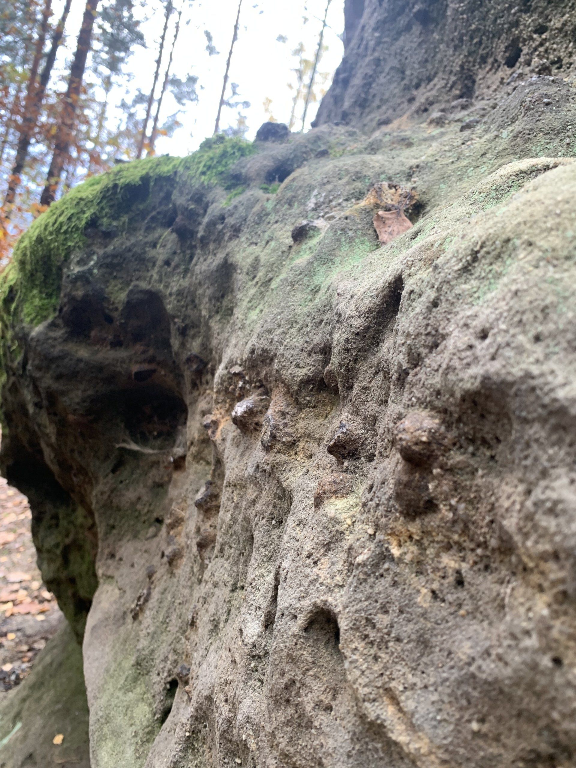 Wechseln wir die nun auf die südliche Seite des Rauensteins können wir unsere noch anstehenden Ziele des Sandsteintouren-Tages erkennen, blicken wir doch auf den großen und kleinen Bärenstein. An dieser Stelle des Gratweges werden wir im Laufe des Tages noch einmal vorbei kommen, folgen diesem jetzt aber erst einmal in abwechslungsreichem Gelände über künstliche Steighilfen und über stählerne Brücken in westlicher Richtung (gelber Strich). Sanft kommen wir am Ende des Rauensteines an, kurz rechts und gleich wieder links abbiegend zum Geotop Pudelstein. Die Eiseneinschlüsse sind gut zu erkennen, eine Tafel erklärt uns wie diese entstehen.