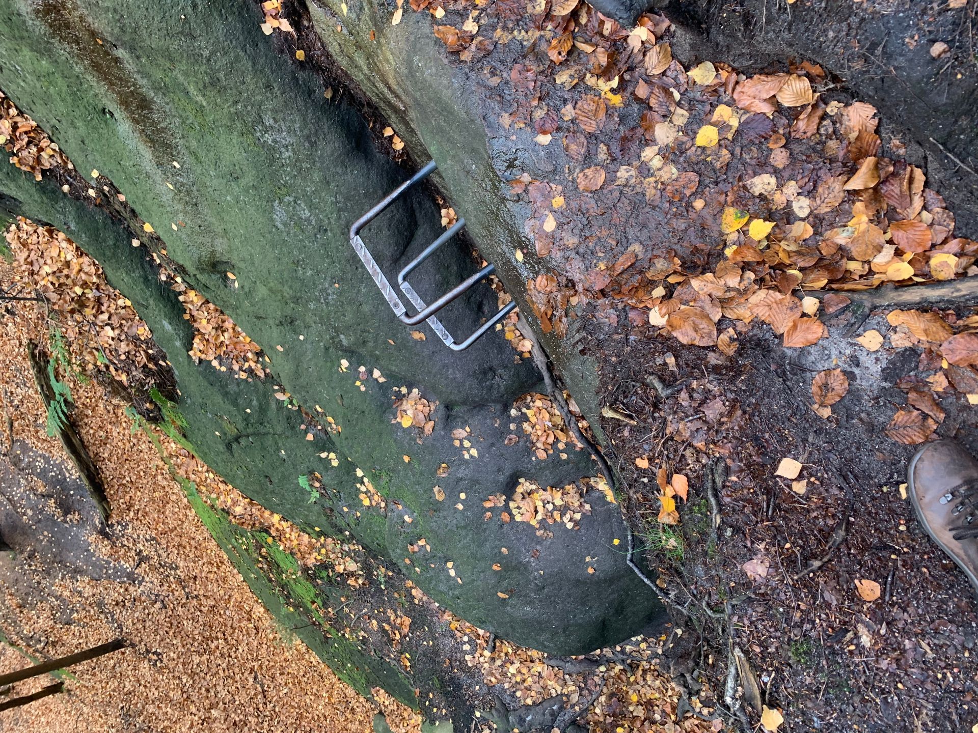 Sehr abwechslungsreich zwischen Heidekraut und durch Felsen wandern wir mit kurzen Kraxeleinlagen bis wir den Lehnsteig kreuzen. Die Bergungsbox im Blick erkennt man den weiteren Verlauf des Pfades. Auf Höhe des vorher umgangenen Lehnriffes sahen wir schon die erste kurze Kletterstelle die es nun zu meistern gilt. Diese gehört noch zu den leichteren Passagen des heutigen Tourenverlaufes. Im Bereich des breiten Horns gibt es auch eine Möglichkeit durch einen sehr engen Spalt (mit abgesetztem Rucksack) etwas abzukürzen. Eine kurze ausgesetzte Stelle an welcher uns eine Wurzel weiterhilf gilt es nun unter höchster Konzentration zu überwinden! Der folgende Bereich (am rechten Rand des Heringsloches) ist mit vielen Pfaden durchzogen und die Wegfindung nicht eindeutig! So "verirren" wir uns irgendwo inmitten vieler umherliegender Felsmurmeln und müssen auf der Hut sein nicht zu tief in ein (mit vielem Laub bedecktes) Loch zu fallen. Ein umsichtiger Blick lässt uns die 2 Eisenklammern, welche zum Zustieg der Rübezahlstiege gehören, erkennen und geleiten uns aus diesem Gerölllabyrinth hinaus. Der weitere Weg ist jetzt wieder klarer zu erkennen. Erste Blicke hinüber zur Herigsgrundnadel und dem Muschelkopf zeigen grandiose Bilder und wir bewundern die Kletterer an der Fluchtwand. Gar nicht mehr weit und wir erreichen die Eisenleitern der Heiligen Stiege.