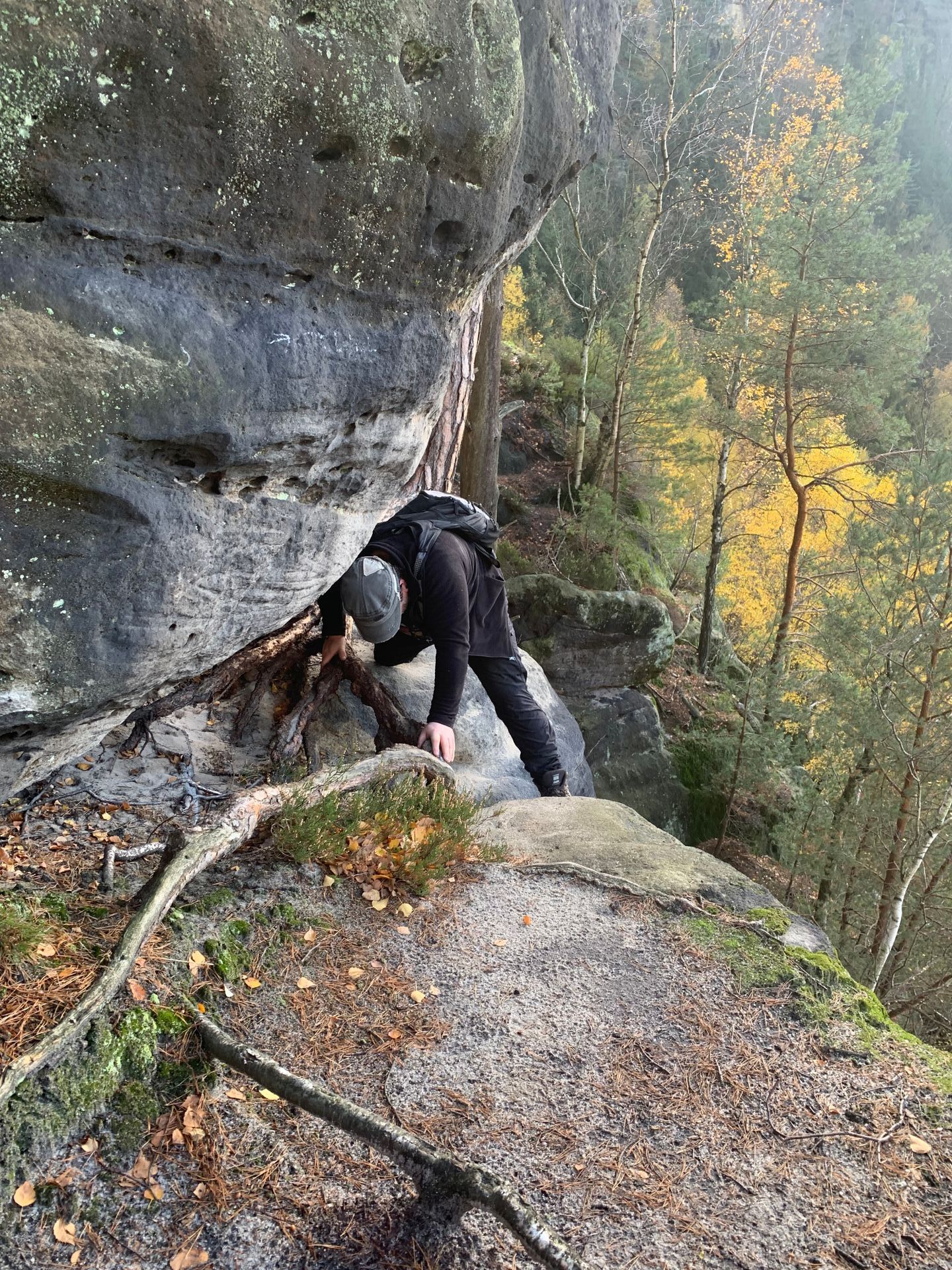 Starten wir also auf dem Parkplatz in Schmilka und nehmen den Weg durch den malerischen Ort und weiter über den Wurzelweg (gelber Strich). Es geht nun stetig Bergauf, wir folgen weiterhin dem Wurzelweg (nun grüner Punkt) und lassen auch den Lehnsteig links liegen. Von rechts mündet etwas später der "Neuer Weg" aus Richtung Poblätzschwände ein, und die Felsen treten langsam enger zusammen. Kurz bevor der Wurzelweg einen starken Linksknick macht sehen wir auf der Linken Seite einen Wurzelteller hochkant liegen. Dahinter beginnt nun unser Pfad als unterer Terrassenweg. Immer nah am Felsfuss entlang windet sich der Weg entlang, und schon die ersten Meter begeistern und beeindrucken. Um das nicht zu verpassen empfehlen wir den Pfad nicht erst ab dem Lehnsteig zu begehen.