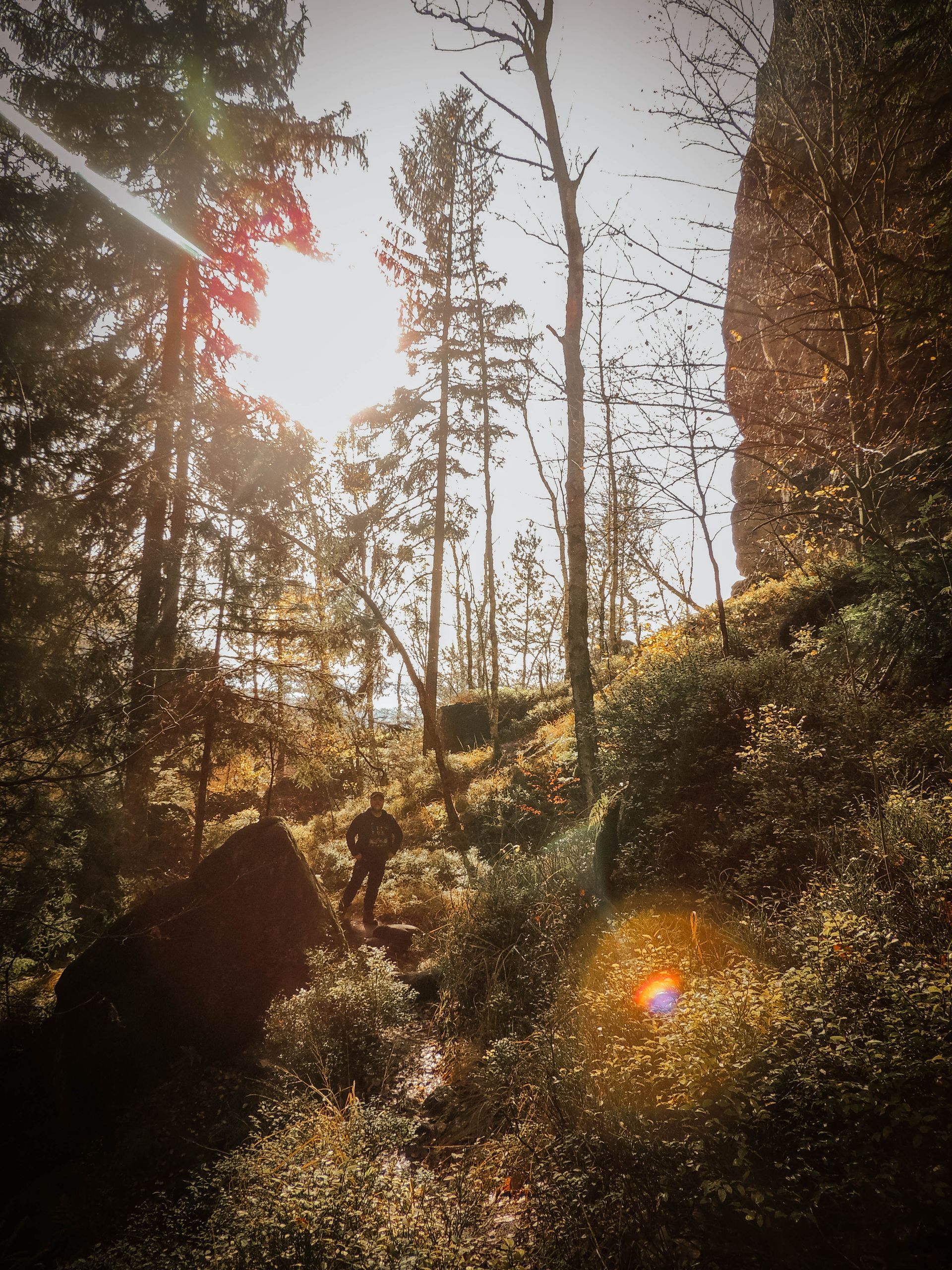 ...müssen wir doch einige Meter zurück gehen. Nutzen dann den etwas tiefer gelegenen Pfad in Richtung Rauschentor. Als sich die dichte Vegetation öffnet haben wir dieses auch schon erreicht, treten hindurch und gelangen so auf den Elbleitenweg (grüner Punkt/grüner Strich). Am Rauschenstein vorbei folgen wir der Wegmarkierung grüner Strich, mit kurzem Abstecher zur kleinen Bastei, die Kahntilke hinunter und an der Elbe entlang zurück zum Parkplatz. Es war ein eindrucksvoller Sandsteintour Tag mit tollem Sommerwetter mitten im November. Der untere Terrassenweg ist eine absolute Schönheit aber nur mit der nötigen Vorsicht und entsprechender Erfahrung zu empfehlen. Wir verarbeiten nun die Eindrücke und melden uns demnächst mit einer neuen Tour.