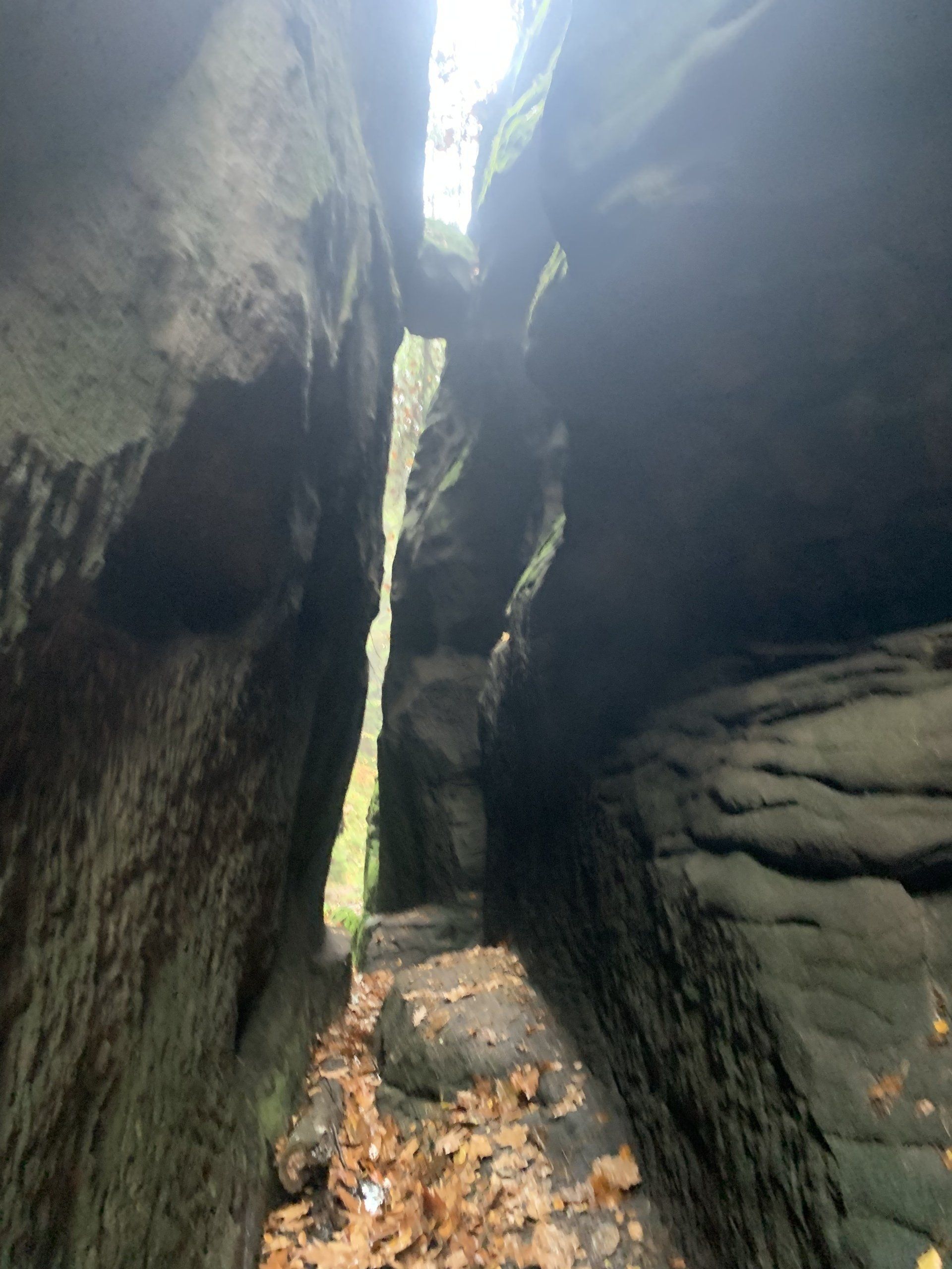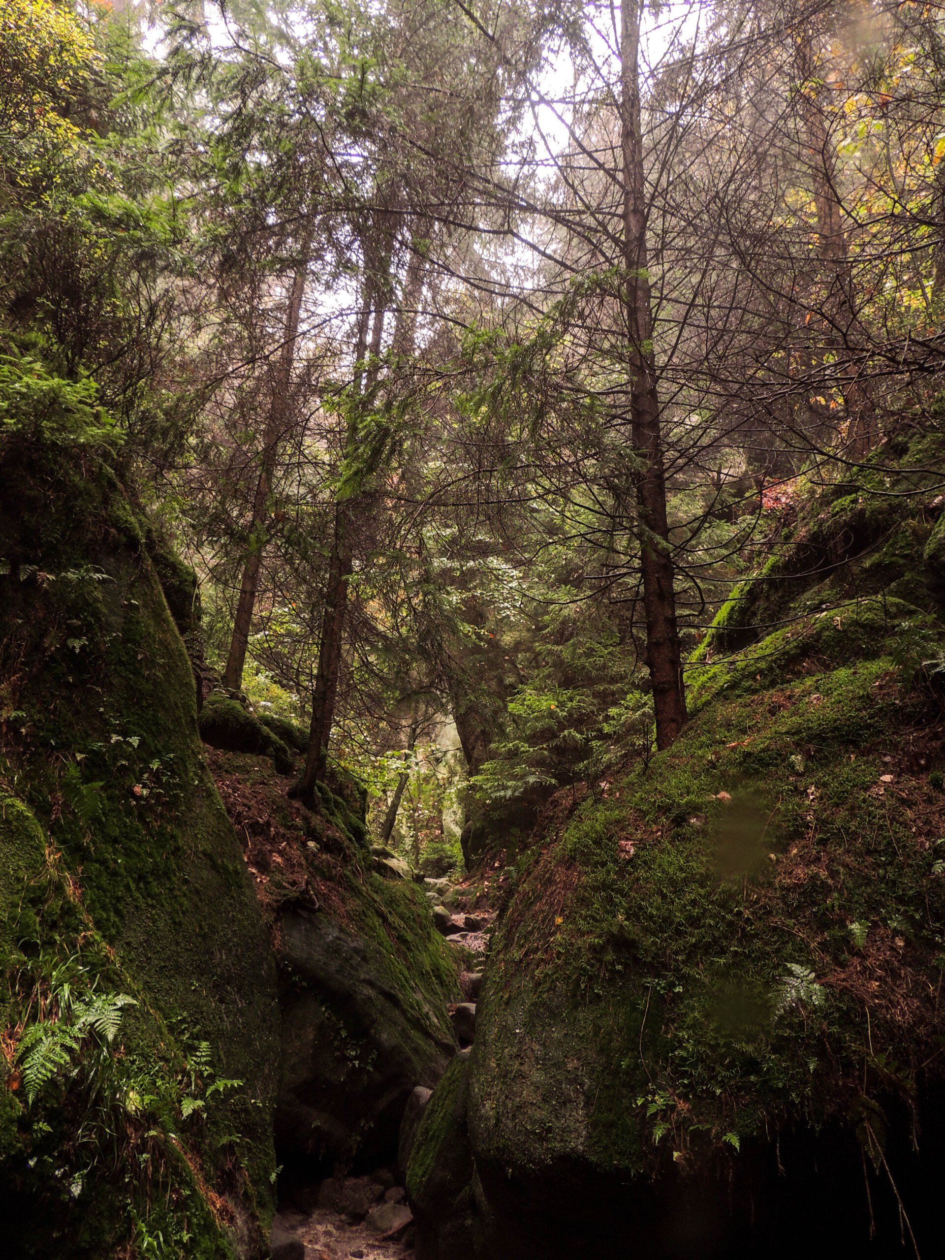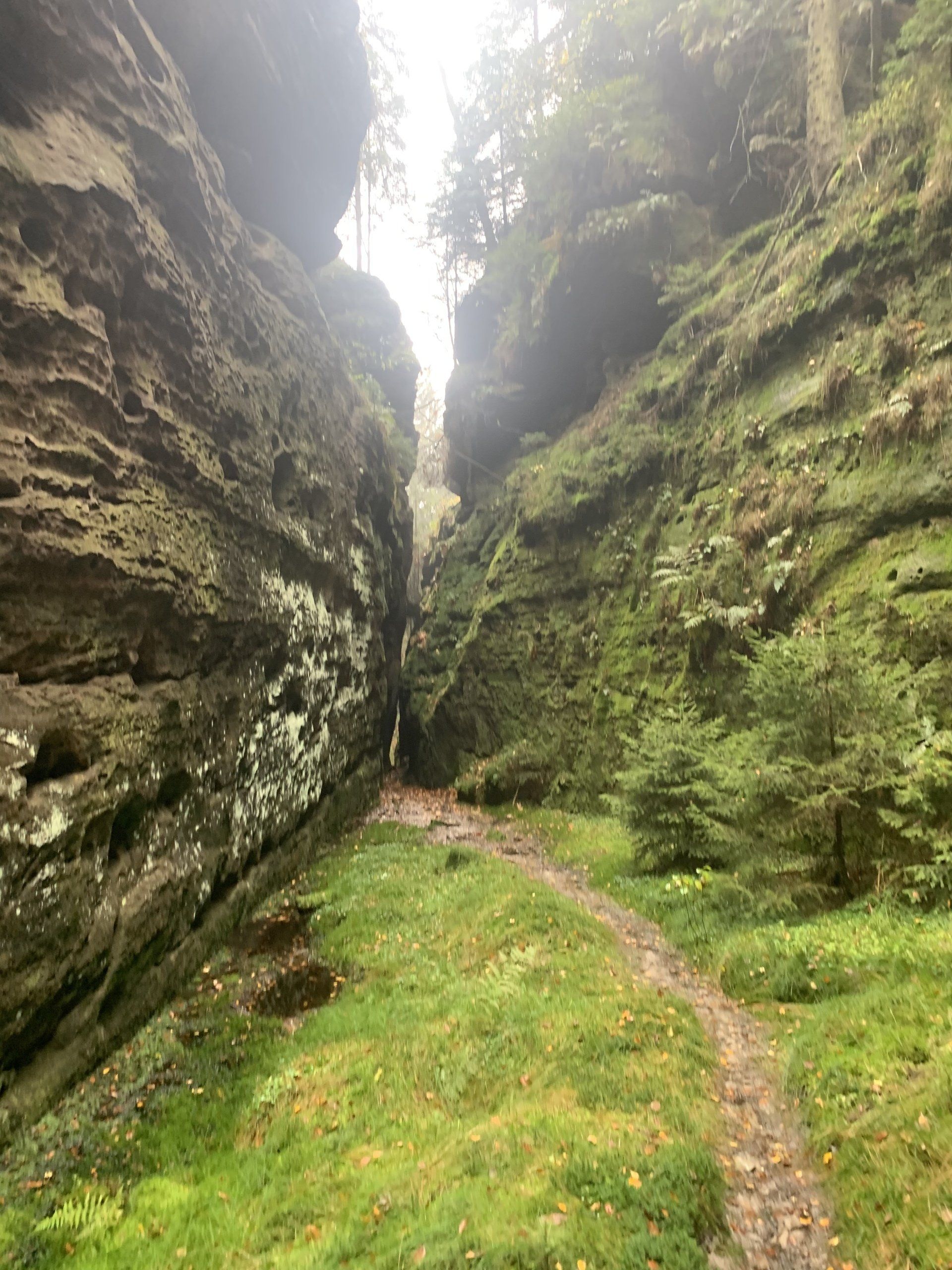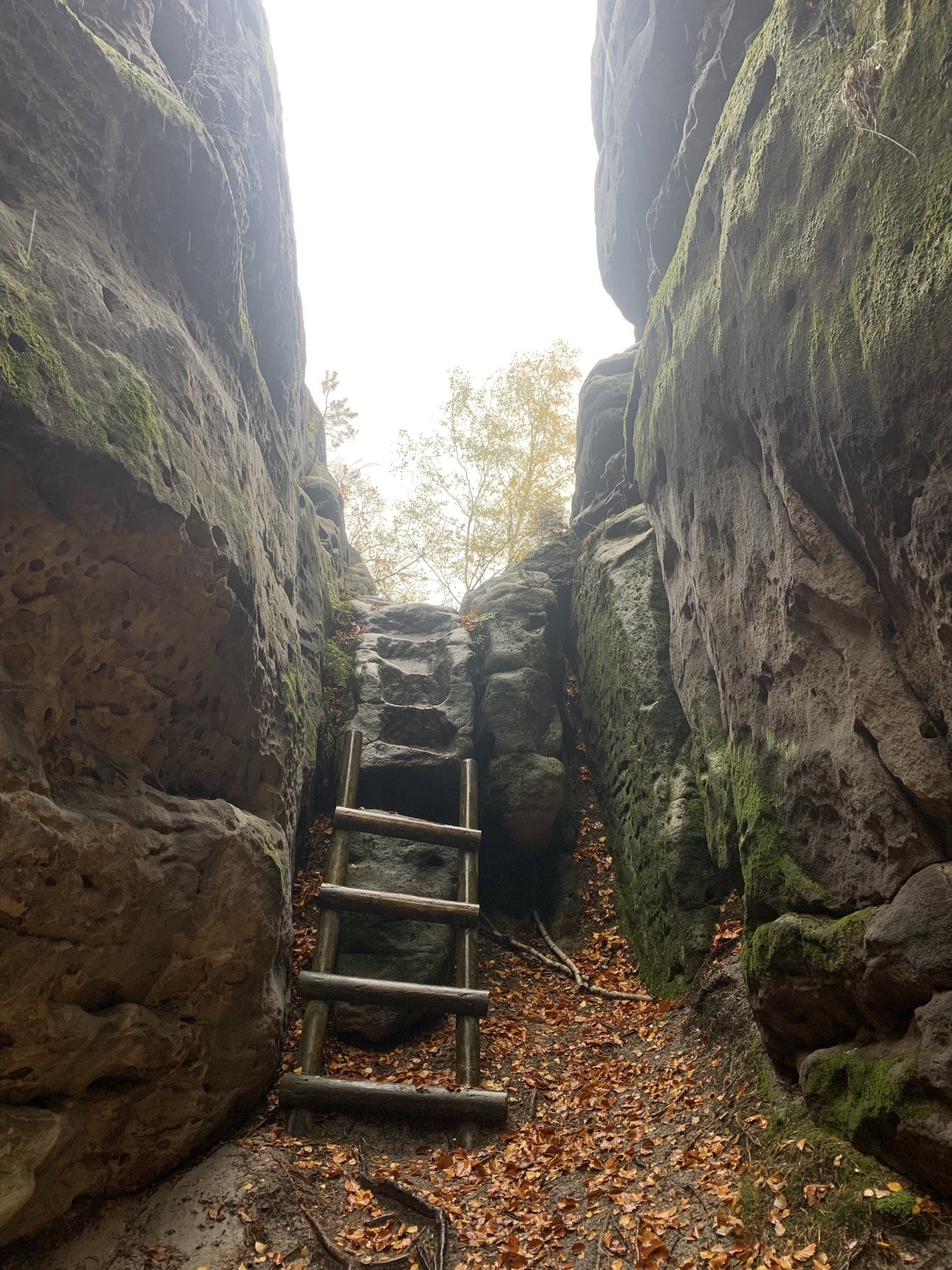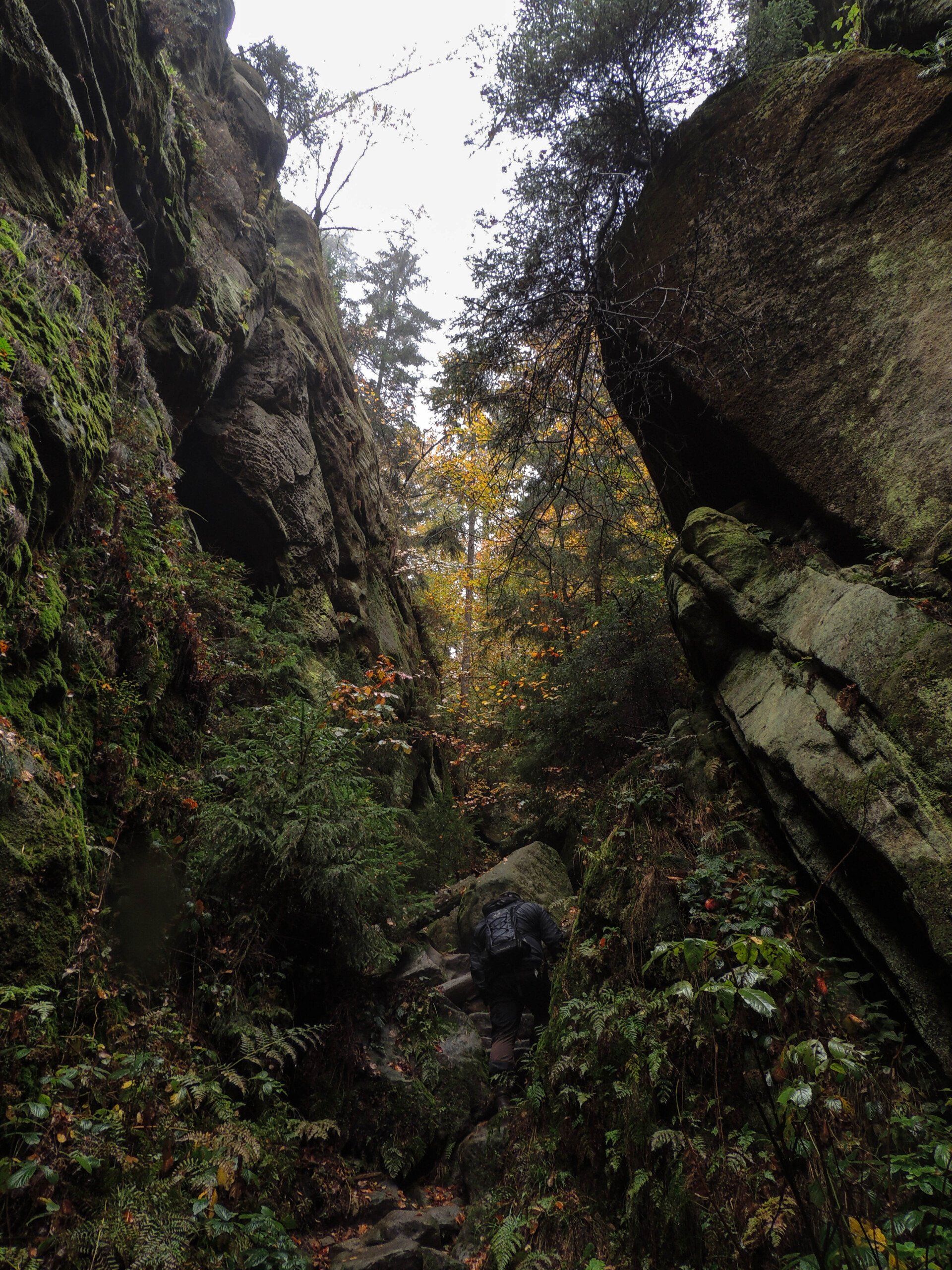 Vorbei an den Schaukästen der Bergwacht nutzen wir an der Kreuzung zur Felsenbühne den Aufstieg zur Bastei (grüner Strich). Über mehrere Stufen und Kehren vorbei an der Burg Neurathen erreichen wir die Basteibrücke. Trotz des schlechten Wetters sind etliche "Selbstfotograhpen" damit beschäftigt sich in Szene zu setzten. Einige bringen wir augenscheinlich kurz aus dem Konzept indem wir uns mit forschem Schritt den Weg durch die Pfützen stapfend "frei kämpen". Schnell zwischen Hotel und Restaurant durch, biegen wir am Kiosk in Richtung Steinerner Tisch ab. Doch nur wenige Meter später gleich wieder links die "Plattenstrasse" zur Müllabfuhr nutzend, geht es diese kurz zurück in Richtung Restaurant. Der Pfad (als Kletterzustieg gekennzeichnet) welcher dann rechts in Richtung Tal abzweigt dürfen wir nicht verpassen. Durch eine Felsengasse steigen wir auf den Absatz zum Wartturm (Kletterfelsen, Felssturz 2000) ab. Die Pfade sind zum Teil recht schmal und ein gewisser Orientierungssinn ist gefordert. Die Wanderapp Komoot hilft hier leider nur bedingt weiter, nicht alle Wege sind darin verzeichnet! Ein kurzer Stiegenteil mit einigen Eisenklammern bringt uns in den Hirschgrund. Dieser Teil wird auch als Zustieg zur Rahm-Hanke genutzt. Unten im Hirschgrund angelangt geht es nun links noch einige Meter Bergab bis zum Haldenweg welchem wir in westliche Richtung folgen.