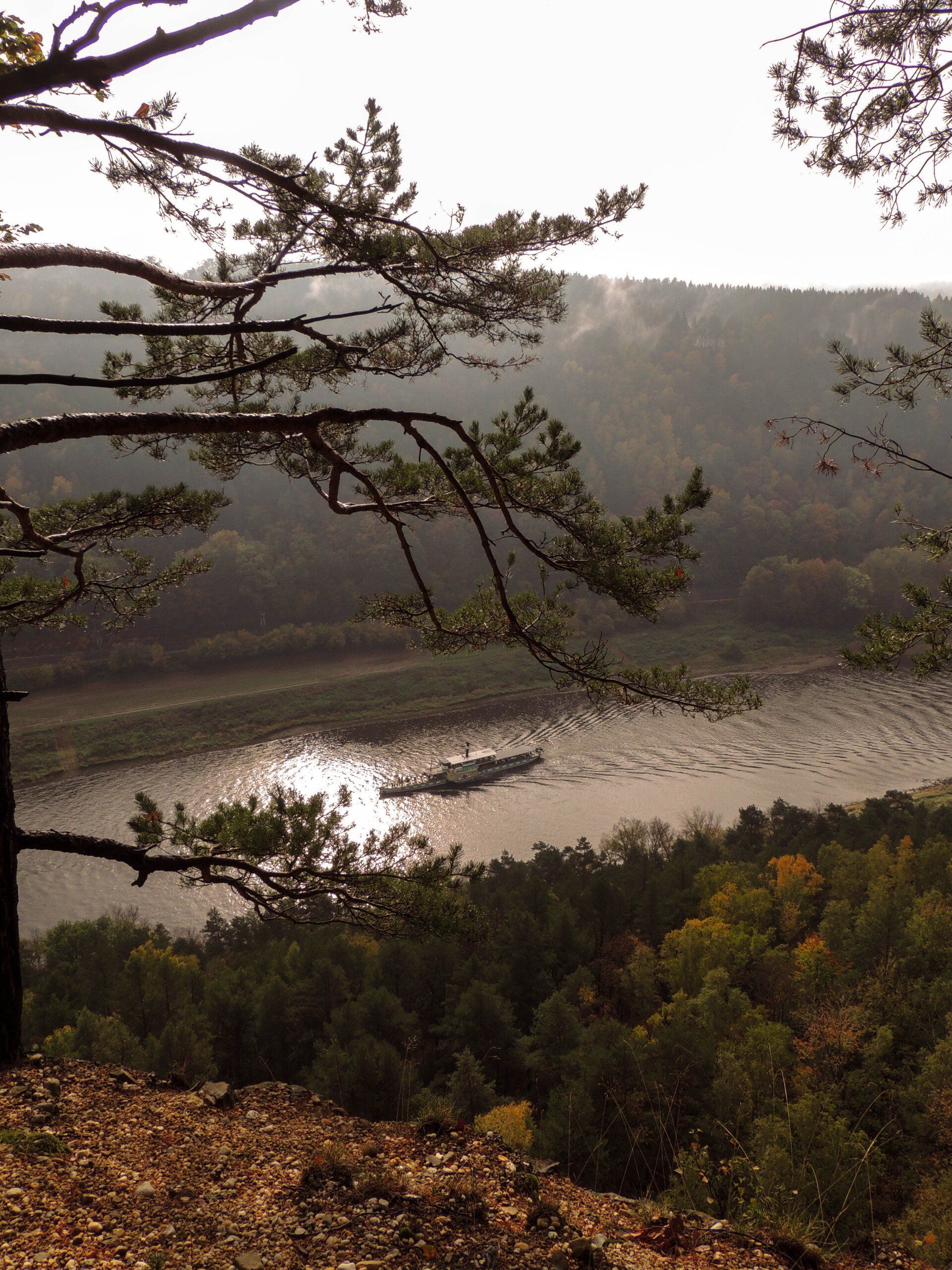 Und zwar genau bis uns nun rechter Hand der nächste "Stille Grund" den Weg wieder hinauf weist. Mit einem grünen Dreieck markiert steigen wir jetzt den Griesgrund hinauf. Urige Natur, schmaler Pfad und beeindruckende Flora....ein Erlebnis. Etwas Krexelei ist gefordert, auch eine Eisenklammer schon etwas ins Alter gekommen hilft, um den Grund bis hinauf zum Fremdenweg (grüner Strich / roter Punkt) zu bewältigen. Auf diesem links haltend können wir am Steinernen Tisch kurz durchschnaufen um dem Schwarzbergweg (Malerweg) in Richtung Wehlen einzuschlagen. Auch hier deutlich sichtbar die Waldbrandschäden vom Sommer....und es regnet noch immer. Erreichen wir eine Kreuzung mit 4 Wegen nutzen wir den einen (links abbiegend), der uns auffordert über das Holzgeländer zu steigen. Das grüne Bergpfadzeichen zeigt uns dann auch an: wir befinden uns auf dem "Stille Gründe" Steig. Eine ganze Weile geht es recht eben auf ziemlich breitem Weg bequem voran bis wir an der Abbruchkante oberhalb der Weisen Brüche ankommen. Einige Meter über der Elbe machen wir jetzt Mittagsrast, tut sich doch gerad ein kurzes "Wolkenloch" über uns auf. Tolle Aussichten in und über das Elbtal werden hier geboten, doch Vorsicht! Der Abgrund der Weißen Brüche ist allgegenwärtig.